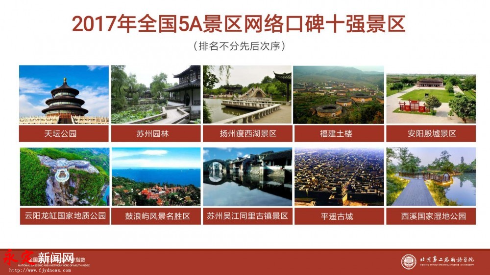視頻加載中... 永定新聞網訊(劉琦 溫永招) 真厲害!龍巖市永定區繼入榜“2017中國全域旅游魅力指數排行榜”后,土樓又進入2017年中國5A景區網絡口碑十強榜,實現魅力口碑雙豐收 。 11月24日,由北京第二外國語學院主辦的“第三屆智慧旅游與營銷年會暨中國5A景區網絡口碑指數發布會在北京舉行,永定土樓景區在全國250家5A景區中,脫穎而出,重榜入選,獲得全國5A景區網絡口碑十強景區殊榮。此前,永定區還進入“2017中國全域旅游魅力指數排行榜”,通過對土樓5A問題的整改提升,長效管理,不斷地提高游客滿意度,實現了魅力口碑指數雙豐收,極大地提升了永定土樓景區對外形象。 據悉,該榜單基于北二外旅游大數據中心眾譽口碑大數據平臺實時抓取全國250家5A景區過去一年內國內主流OTA平臺上評價數據,共計50余萬條數據,平均每個景區2000條左右。通過抓取普通民眾及時、真實、原創的旅游評論,反映了各個旅游城市在廣大網民心中的形象。 2017年1-10月份,永定區共接待國內外游客650.26萬人次,比增25.3%,實現旅游總收入64.69億元,比增35.3%,接待境外游客8.37萬人次,比增15.4%,旅游創匯4574.67萬美元,比增20.9%。國慶中秋假期借助央視的平臺,在《新聞聯播》、英語頻道等欄目中向全球觀眾展示了永定土樓的獨特魅力,實現了旅游人數、旅游收入和宣傳效果“三豐收”。 2017年全國5A景區網絡口碑十強景區(排名不分先后次序):天壇公園、蘇州園林、揚州瘦西湖景區、福建土樓、云陽龍缸國家地質公園、鼓浪嶼風景名勝區、蘇州吳江同里古鎮景區、平遙古城、安陽殷墟景區、西溪國家濕地公園. |