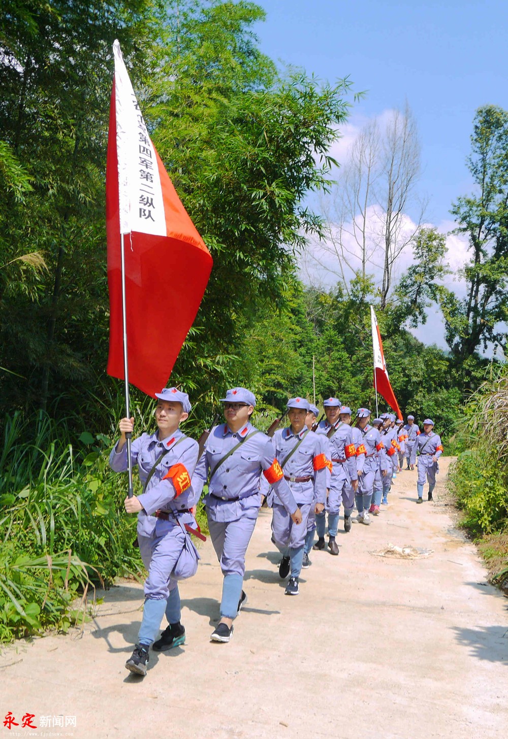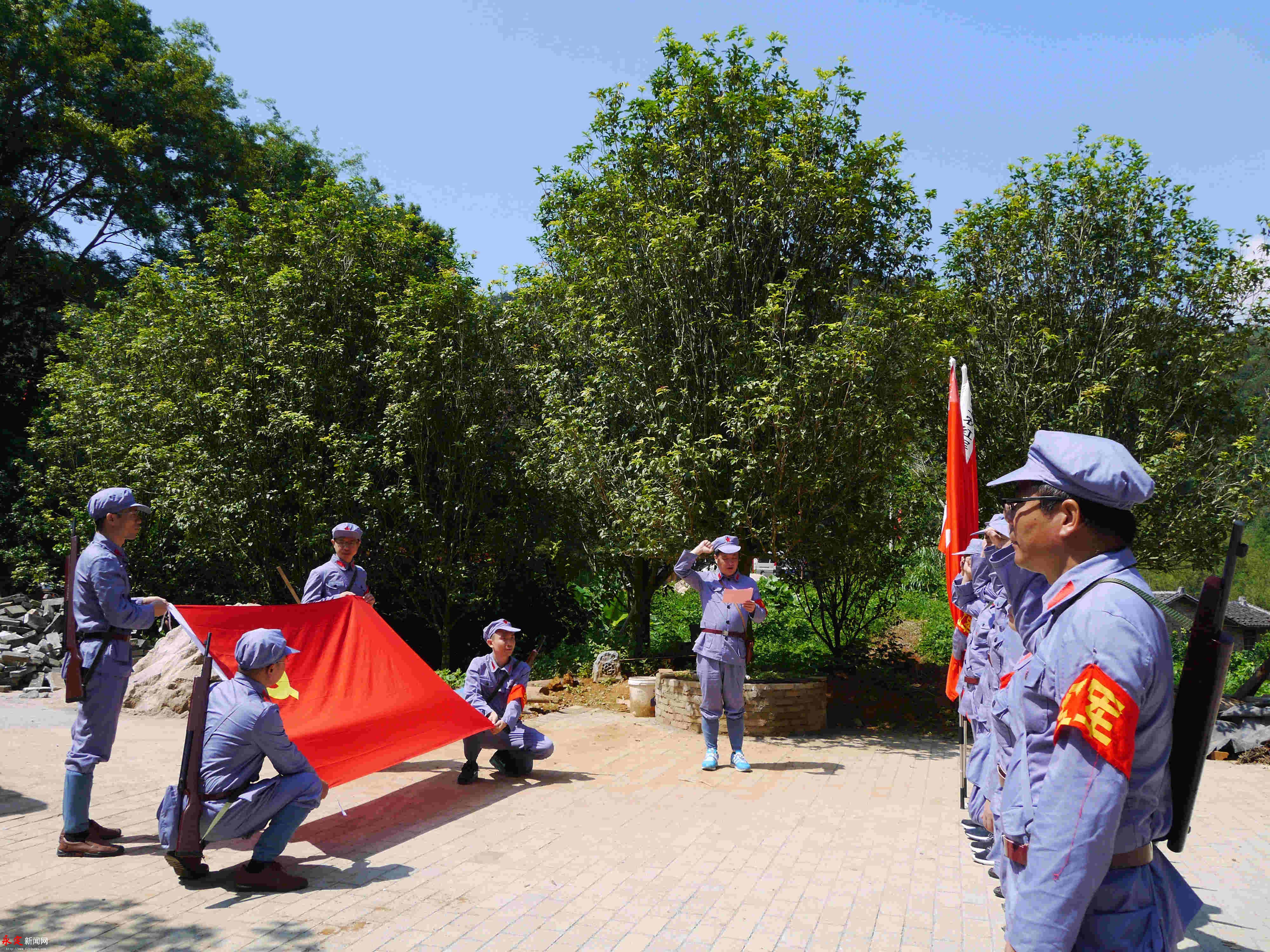 重走紅色交通線。劉永良 攝 在伯公凹,黨員們頂著炎炎烈日,身著紅軍服,頭戴八角帽,高舉“閩西工農紅軍第四軍第一縱隊”“閩西工農紅軍第四軍第二縱隊”的軍旗,行走在崎嶇的山路,重走紅色交通線,追尋老一輩足跡,重溫那段不能忘卻的歷史。“因為秘密工作的緣故,不少人名姓不詳,英名埋沒于青山,成為無名英雄。是什么,讓他們如此堅定?是什么,讓他們如此無畏?是什么,讓他們獻出生命也在所不惜?”在山間古道,黨員們邊走邊思考:“除了紅色的信仰,還能有別的什么力量?” 在交通站舊址前,參加活動的黨員整齊列隊,在區(qū)委常委、宣傳部部長曾佑繁的帶領下,面對鮮紅的黨旗,舉起右手、握緊拳頭,重溫入黨誓詞,牢記共產黨員的責任和使命。同時,在伯公廟、交通站舊址前,黨員們用心聆聽烈士后代鄒廣敦講解了一個個驚心動魄而又令人肅然起敬的感人故事,回顧烽火連天的革命歲月,深刻緬懷革命先烈的英雄事跡和豐功偉績。
