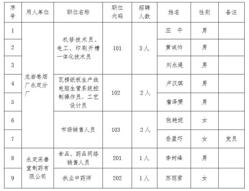 根據《福建海峽客家投資發展集團有限公司公開招聘公告》精神,經公開報名、資格審查、面試或專業測試、組織考察、體檢、海發集團會議研究錄用等工作程序,現將9名擬錄用人員予以公示。公示時間從2021年2月22日開始,公示期為五個工作日。如有異議,請向區紀委監委派駐區財政局紀檢組(電話:3353203)或海發集團人力資源部(電話:3093581)反映。