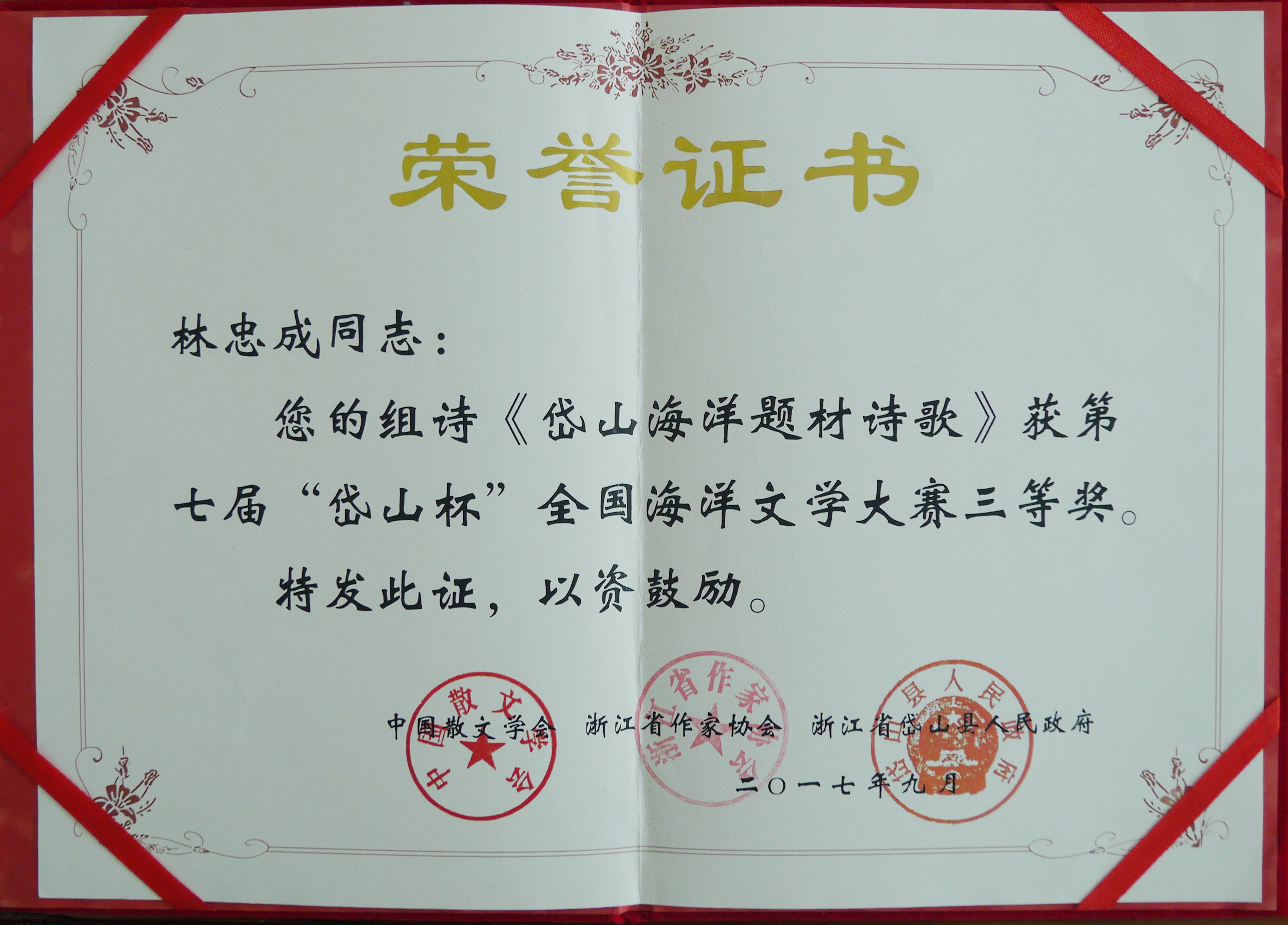 林忠成的組詩《岱山海洋題材詩歌》榮獲全國海洋文學大賽三等獎