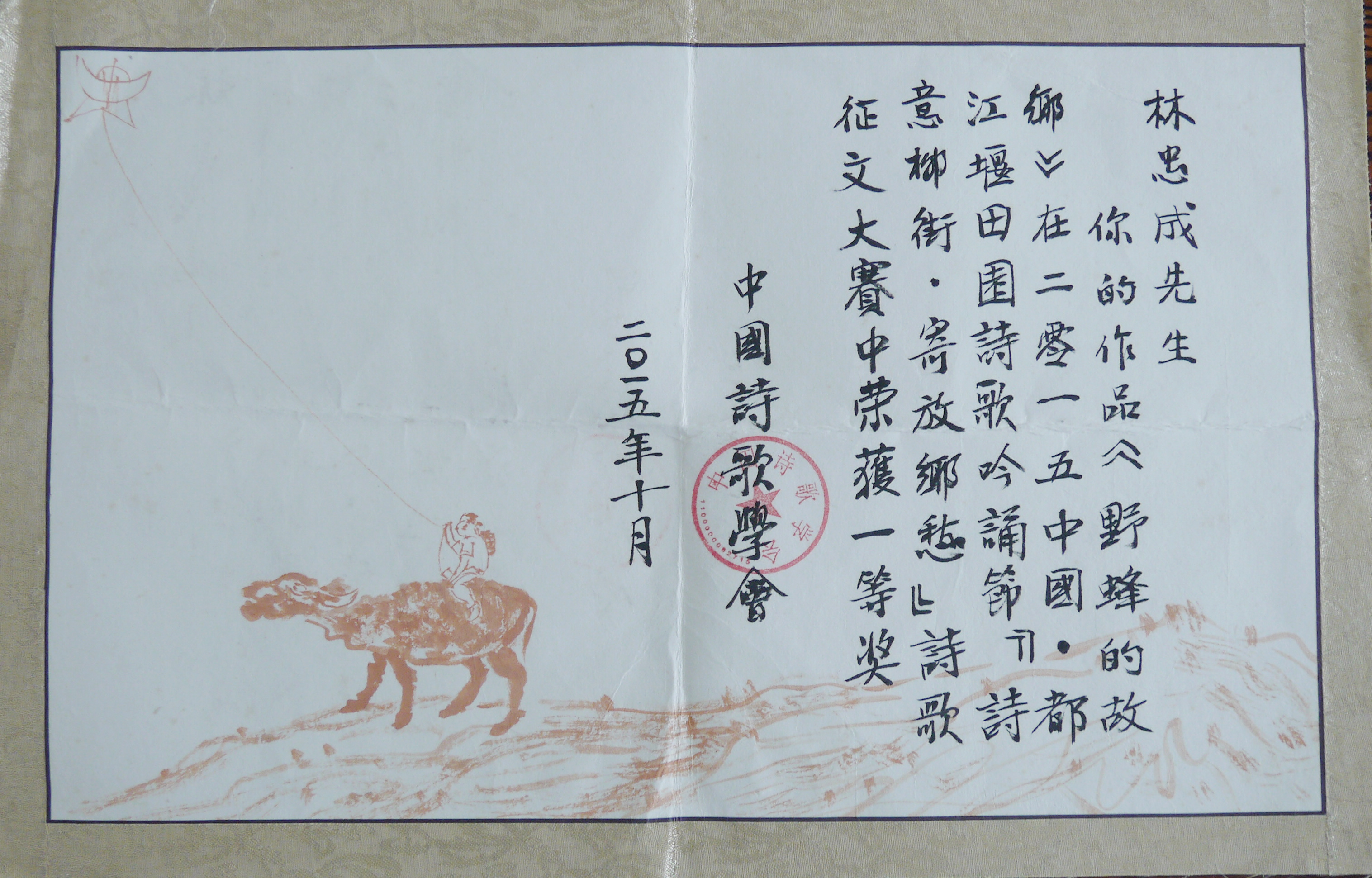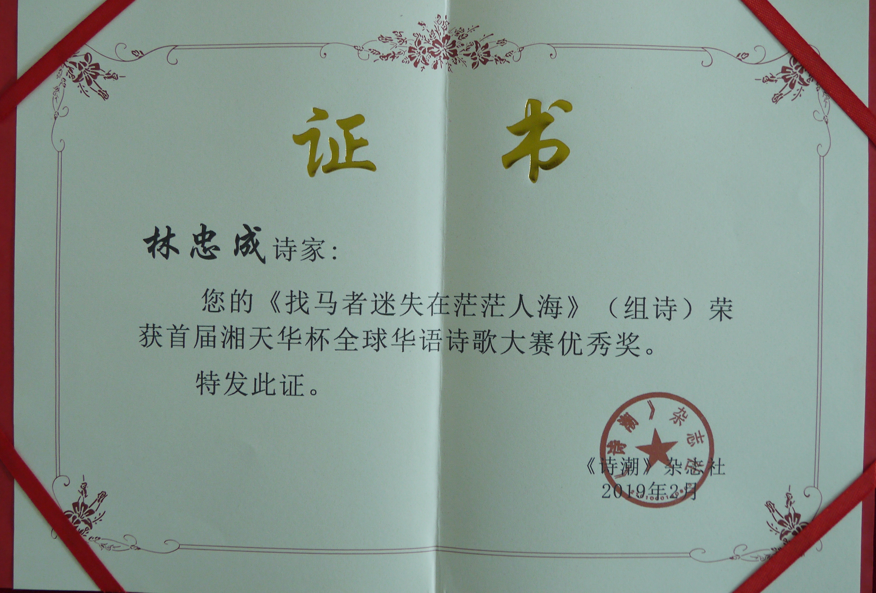 林忠成的《找馬者迷失在茫茫人海(組詩)》榮獲首屆湘天華杯全球華語詩歌大賽優秀獎