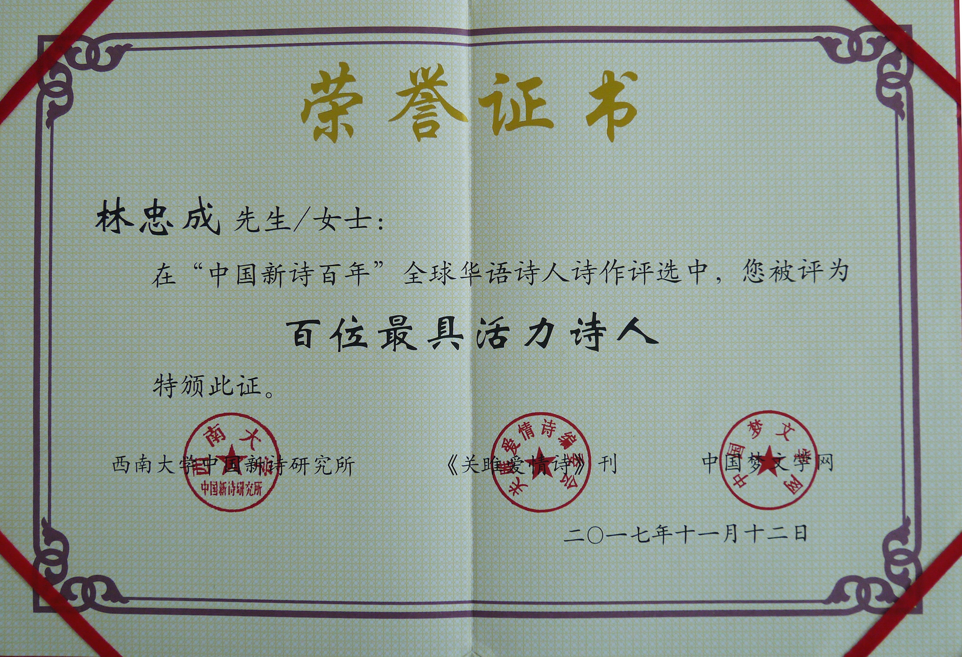 林忠成在“中國新詩百年”全球華語詩人詩作評選中,榮獲“百年最具活力詩人”稱號