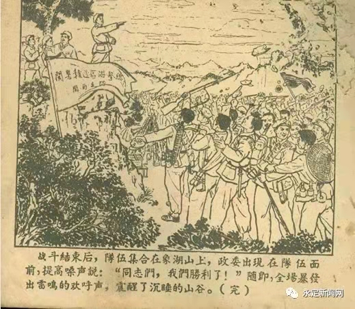 “天降神兵”再克頑敵 閩西支隊摧毀攻克九象鄉公所后,又在撫市河凹頭與跟蹤敵人打了一場遭遇戰,然后轉移至永杭邊雙髻山休整。1948年10月初,來到廣東大埔巖上大老寨進行整編,將永和埔獨立大隊并入閩西支隊,全支隊已發展到200多人,下轄一、三兩個大隊。與此同時,敵人不甘心失敗,瘋狂反撲,派出敵保二團配合閩粵邊敵人策劃了“十字清剿”行動,重新盤踞象湖山,重修碉堡,強迫群眾重建鄉公所,成立了“剿共指揮部”,并羅織九象、蘆溪、維新的反動勢力成立“三鄉聯防反共自衛軍”,總共駐敵60余人。他們氣焰囂張,經常到李家畬、筀竹洋、三溪等地實行報復性“清剿”,先后逮捕和槍殺游擊隊家屬和革命群眾,到處抓丁派款,燒殺搶掠,殘害鄉里,使革命群眾倍受摧殘。為了有力打擊敵人對革命群眾的瘋狂迫害,閩西支隊決定再次出擊攻克象湖山守敵。 同年11月23日上午,支隊長藍漢華做了戰前動員報告,組織了突擊隊,接著,部隊星夜從埔北高乾、甜竹村所在的閩粵邊工委駐地出發,行軍五六十里,到達象湖洋竹里。湖山工作團和當地黨支部立即組織群眾做好給養和接待工作,并組織群眾連夜加班建造特長云竹梯,全力支持解放軍再次攻打象湖山之敵。在大象湖武工隊指導員李輝帶領下,五區武裝工作團沈源、鐘錦欽等人強烈要求加入突擊隊,經支隊長藍漢華同意編入云梯登炮樓小組。 次日傍晚,解放軍突擊隊悄悄地從山頂摸索前進,隱蔽到敵人炮樓的外圍。深夜10點多下著小雨,戰士們全然不顧,當支隊長藍漢華行動令下后,突擊組戰士分頭快速行動,剪開鐵絲網翻過籬笆墻,神不知鬼不覺地越過壕溝,摸掉敵人門外哨兵,用四條特長的云竹梯攀架上了碉堡的制高點,隨著一聲令下,鐘華光、沈源和突擊隊員首先開槍,把樓頂上的哨兵消滅掉,從樓上往下打,頓時槍聲四起,手榴彈爆炸。冬雨正好眠的守敵從夢中驚醒,敵中隊長李成輝見勢不妙,從電話機房窗口攀電線滑出來,企圖逃走,卻作惡多端終有報,被我伏擊隊員擊斃。突擊隊從樓頂到樓下,打開大門沖進碉堡內,守敵見狀紛紛繳械投降,負隅頑抗的聯防主任李文輝當場斃命。此戰不到半小時,閩西支隊全殲三鄉聯防隊67人,繳獲長短槍50多支,并救出被關押武工隊的家屬20余人。戰斗結束后召開群眾大會,開展革命宣傳,并把繳獲的糧食物資全部分發給貧苦群眾。閩西支隊臨走時把攻克的敵雕堡再次放火燒毀。