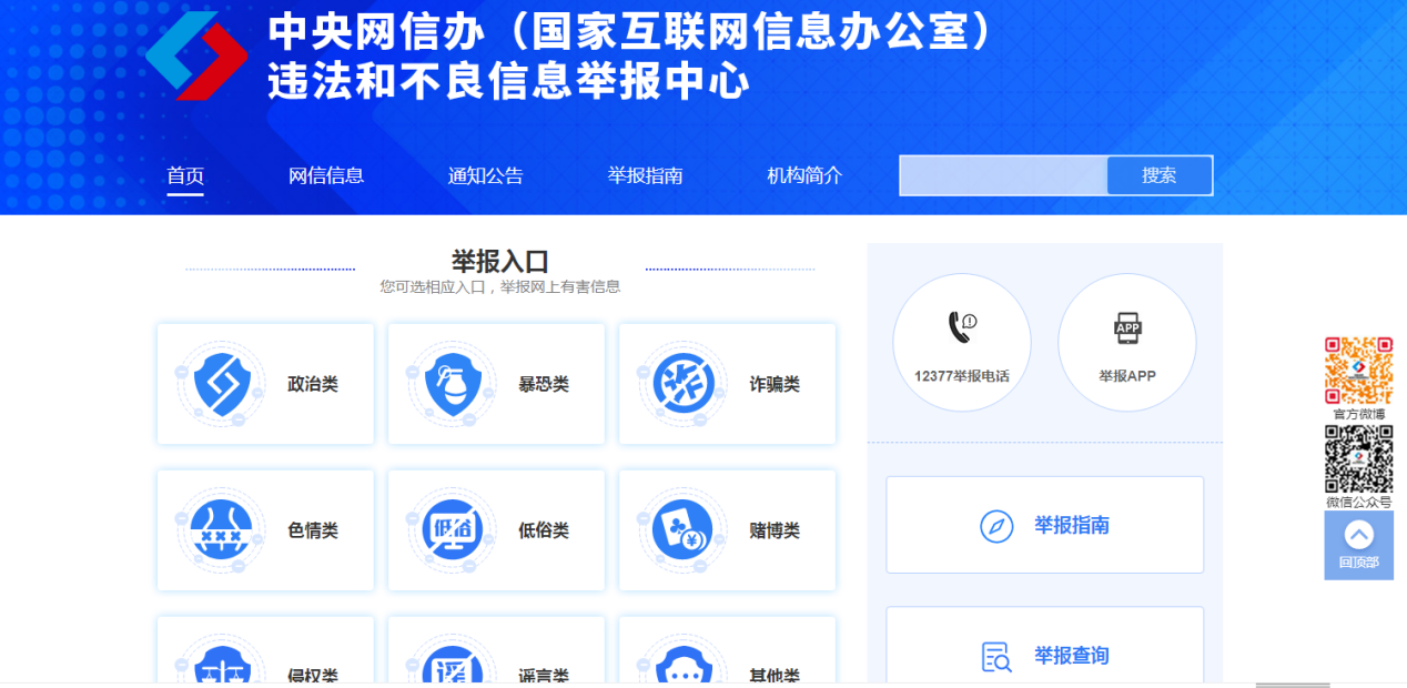 中央網(wǎng)信辦(國家互聯(lián)網(wǎng)信息辦公室)違法和不良信息舉報中心簡介: 中央網(wǎng)信辦(國家互聯(lián)網(wǎng)信息辦公室)違法和不良信息舉報中心統(tǒng)籌協(xié)調(diào)全國互聯(lián)網(wǎng)違法和不良信息舉報工作;指導(dǎo)、監(jiān)督各地各網(wǎng)站規(guī)范開展互聯(lián)網(wǎng)違法和不良信息舉報工作;受理、協(xié)助處置網(wǎng)民對互聯(lián)網(wǎng)違法和不良信息的舉報;宣傳動員廣大網(wǎng)民積極參與互聯(lián)網(wǎng)違法和不良信息舉報監(jiān)督;主辦中國互聯(lián)網(wǎng)聯(lián)合辟謠平臺,統(tǒng)籌做好網(wǎng)絡(luò)辟謠工作;開展國際交流合作,加強(qiáng)與境外國際組織、相關(guān)機(jī)構(gòu)、互聯(lián)網(wǎng)企業(yè)的聯(lián)系,協(xié)調(diào)處理相關(guān)有害信息。 互聯(lián)網(wǎng)違法和不良信息主要包括: 1.危害國家安全、榮譽(yù)和利益的;2.煽動顛覆國家政權(quán)、推翻社會主義制度的;3.煽動分裂國家、破壞國家統(tǒng)一的;4.宣揚(yáng)恐怖主義、極端主義的;5.宣揚(yáng)民族仇恨、民族歧視的;6.傳播暴力、淫穢色情信息的;7.編造、傳播虛假信息擾亂經(jīng)濟(jì)秩序和社會秩序的;8.侵害他人名譽(yù)、隱私等合法權(quán)益的;9.互聯(lián)網(wǎng)相關(guān)法律法規(guī)禁止的其他內(nèi)容。 舉報方式: 1.登錄舉報中心官網(wǎng)https://www.12377.cn舉報; 2.下載安裝“網(wǎng)絡(luò)舉報”客戶端舉報; 3.關(guān)注舉報中心官方微博“國家網(wǎng)信辦舉報中心”,點(diǎn)擊“私信舉報”; 4.關(guān)注舉報中心官方微信公眾帳號“國家網(wǎng)信辦舉報中心”,點(diǎn)擊“一鍵舉報”; 5.撥打12377舉報熱線舉報; 6.發(fā)送郵件至郵箱jubao@12377.cn舉報。 |
