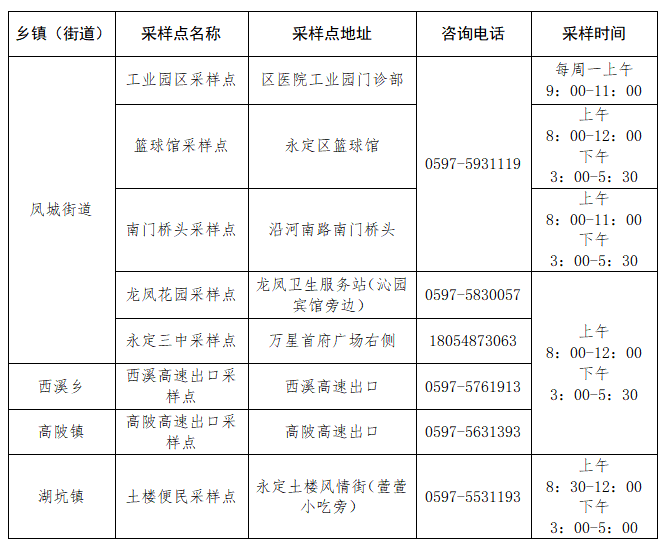 為落實常態(tài)化疫情防控工作需要,方便群眾核酸檢測需求,永定區(qū)在鳳城街道、西溪鄉(xiāng)、高陂鎮(zhèn)、湖坑鎮(zhèn)設立8個便民核酸采樣點,為市民群眾提供免費核酸檢測服務,各采樣點分布如下: