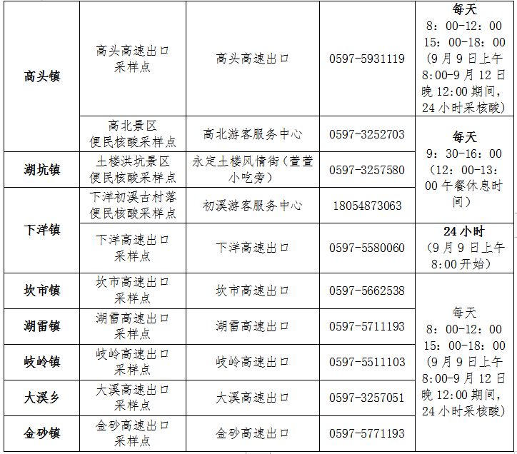 9月9日起,永定區部分便民核酸采樣點開放時間有變,采樣點名單如下:
