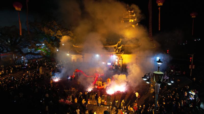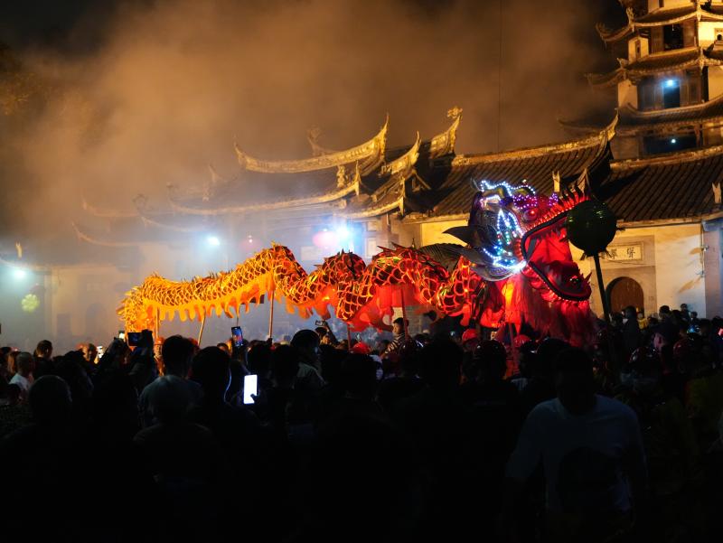 正月十五鬧宗祠,十六鬧親房,十七鬧天后宮,是永定區高陂鎮西陂村傳統鬧元宵的特色。據說,天后宮舞龍鬧元宵已有400多年的歷史。最高峰時各房各支各堂可出到36條龍,今年元宵是近3年最鬧的,出了25條龍,歡慶的鑼鼓、騰飛的舞龍,村民們以此來企盼新春的生活越來越好。“這幾年來,我們的西陂村古建筑保護起來了,旅游也搞得有聲有色。”村里從事旅游業的林華新表示,新的一年里,要和村民一起,在鄉村振興的路上,把家鄉建設得更加美好。