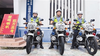 為了確保高考期間考生們的交通安全,永定區公安交警提前謀劃,制定交通安保工作方案,推出公布求助電話、成立鐵騎護考隊、開辟“綠色通道”等措施,為廣大考生保駕護航。圖為“交警鐵騎護航”服務隊。 通訊員 熊川 攝