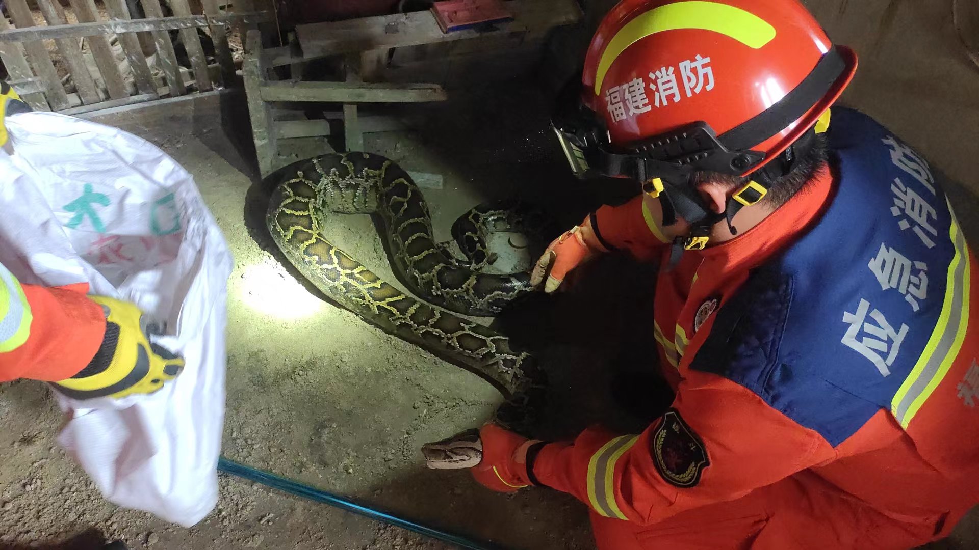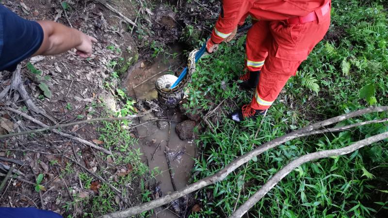 6月6日16時31分,峰市鎮高山村村3-2號一村民家羊圈里有1條蟒蛇。接到報警后,永定鳳城消防救援站立即出動1車和5人前往現場處置。到達現場后,經過詢問報警人與偵查現場環境得知,有1條蟒蛇偷躥入羊圈內,而且剛吃了1只小羊羔,已經對羊群造成了威脅,目前蟒蛇在羊圈的正前方水溝里。經過大約30分鐘的等待,消防員發現蟒蛇露頭,指揮員立即命令3名有經驗的消防員擔當抓捕者,在做好防護措施后,由一名消防員使用捕蛇器按住蛇身,另兩名消防員瞅準時機,迅速夾住蛇頭部,成功將蛇捕獲,裝入袋中。