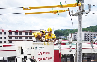 連日來,永定境內持續(xù)出現晴熱高溫天氣,最高氣溫超過40攝氏度,讓全區(qū)電網備受“烤”驗。國網永定區(qū)供電公司派出帶電作業(yè)班,對轄區(qū)線路開展帶電作業(yè),確保高溫天氣百姓用電安全無憂。圖為近日,檢修人員帶電作業(yè)情景。 通訊員 熊川 攝