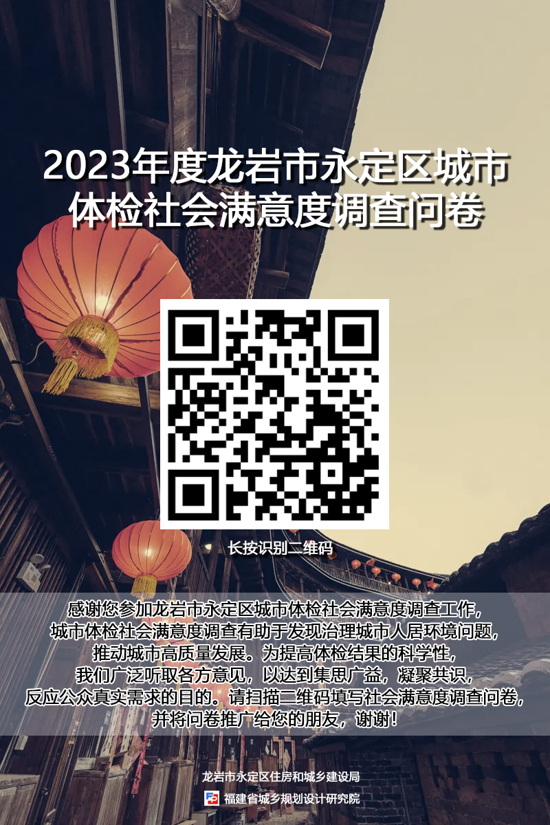 居民朋友們,推動我們居住的城市高質量發展,你的聲音很重要!龍巖市永定區住房和城鄉建設局精心準備了一份《2023年度龍巖市永定區城市體檢社會滿意度調查問卷》,誠邀您一起為城市健康發展把脈問診、建言獻策。請你掃描二維碼,進入問卷并填寫,問卷填寫截止時間:2023年11月10日。