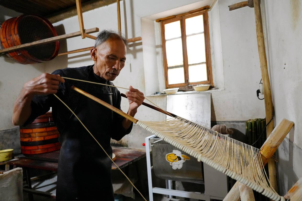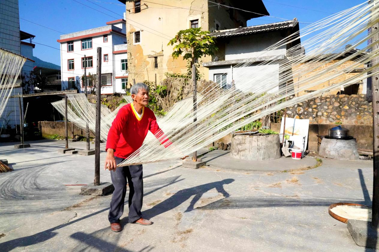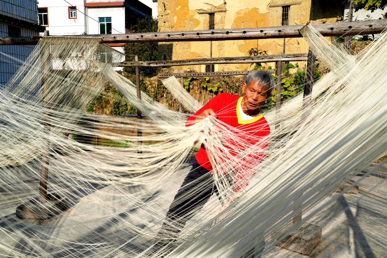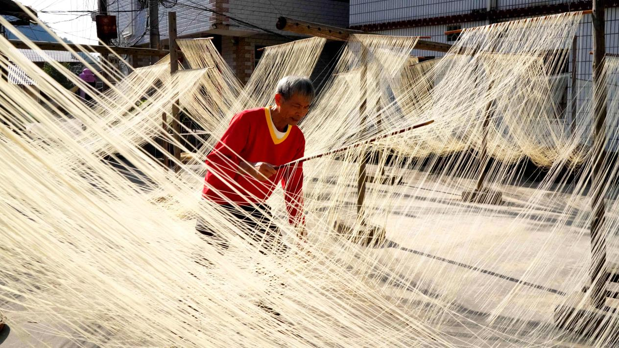 1月12日,一縷冬日暖陽照進永定區高陂鎮上洋村植桂堂村民陳樣民的家中,院子里數十掛手工線面在陽光的照耀下,細白如絲,隨風搖曳,散發著面粉的淡淡清香。老線面師傅們正在拉、扯手中的面條。一根根“筷子”般粗細的面條在其手中慢慢扯、拉成細線,掛在面架上,在陽光的晾曬下,線面漸漸風干……中途,師傅們還會將線面收回屋內,讓其均勻熟成后再掛出去晾曬,等面中隱約出現白色,便可做成了干面。據悉,純手工制作的線面色澤潔白、線條細勻、質地柔潤、落湯不糊,拉開可長達數米。