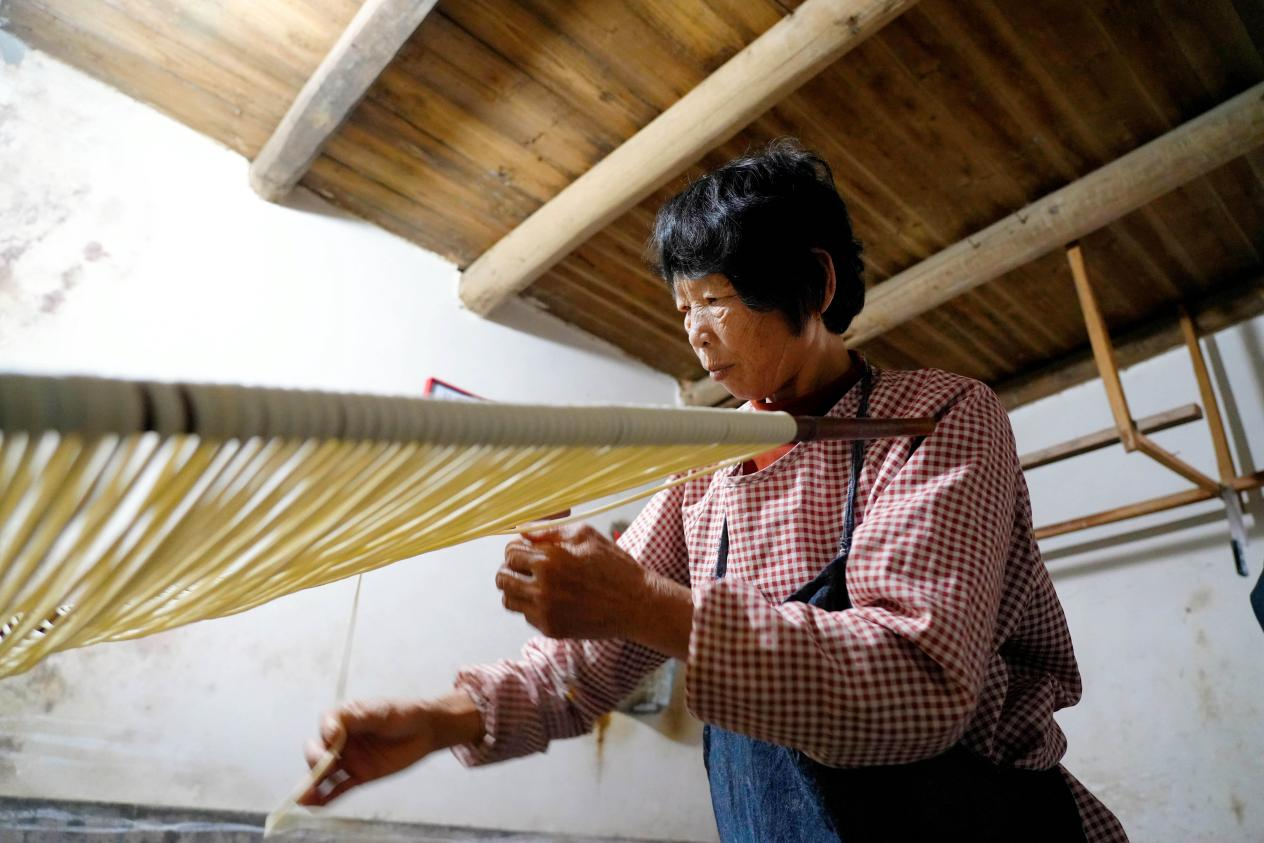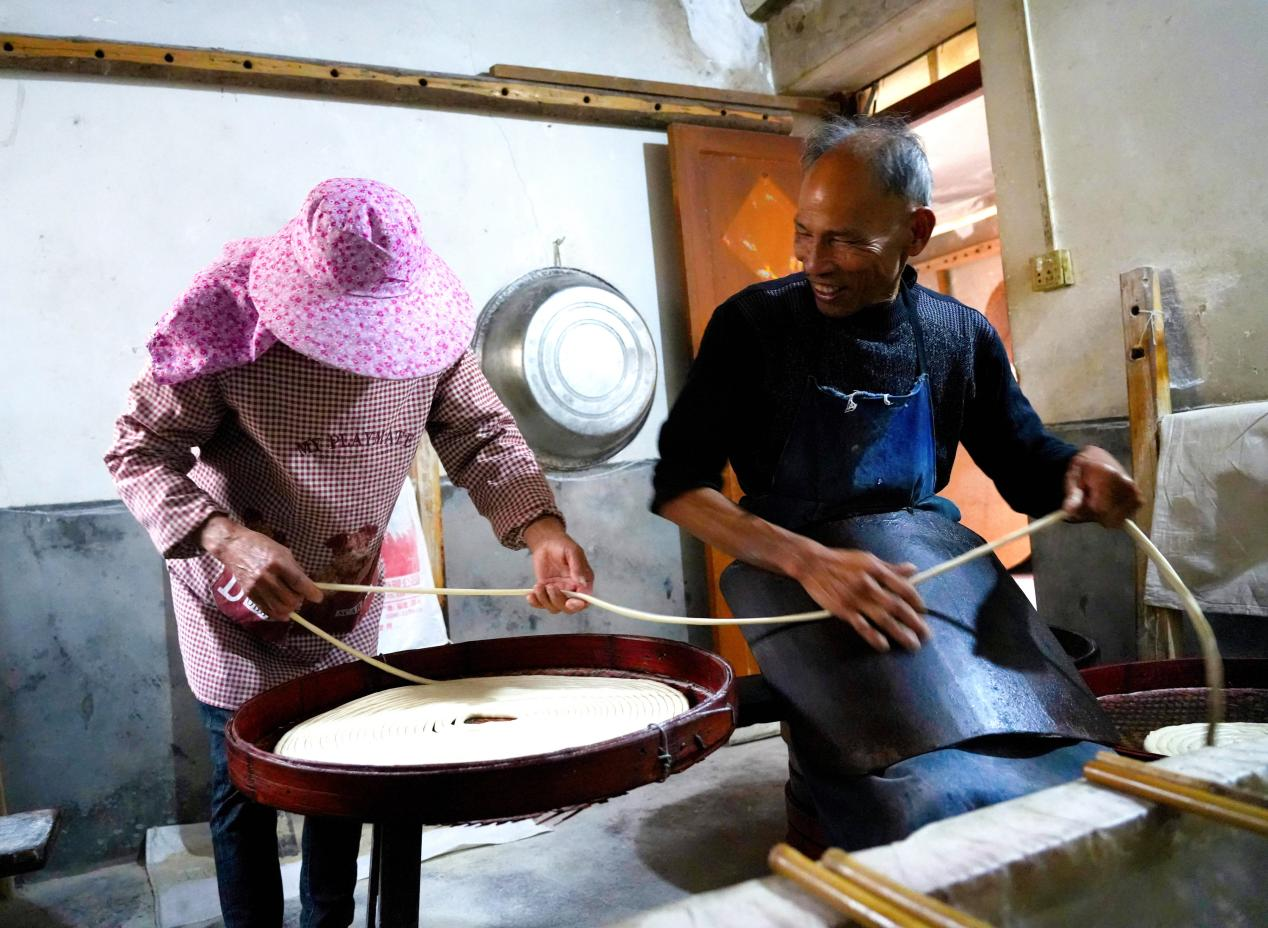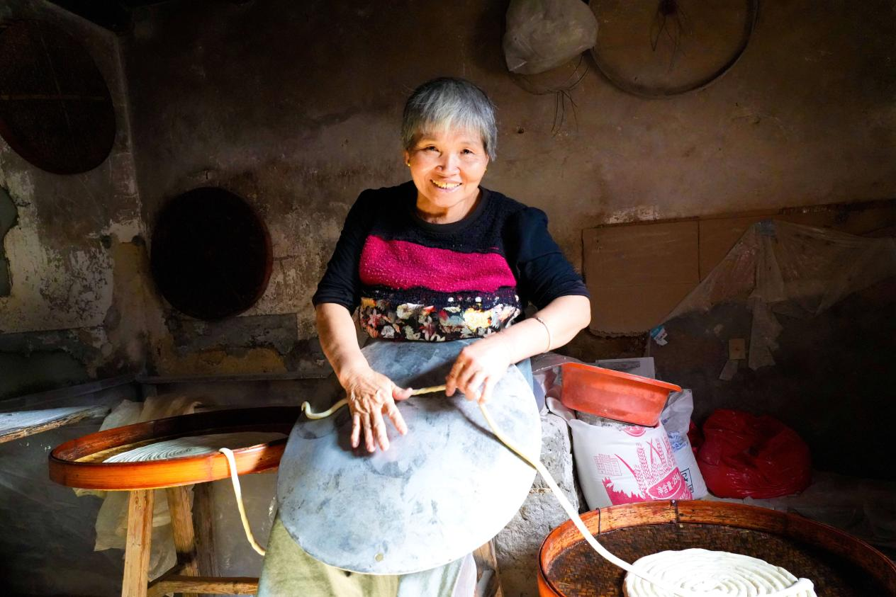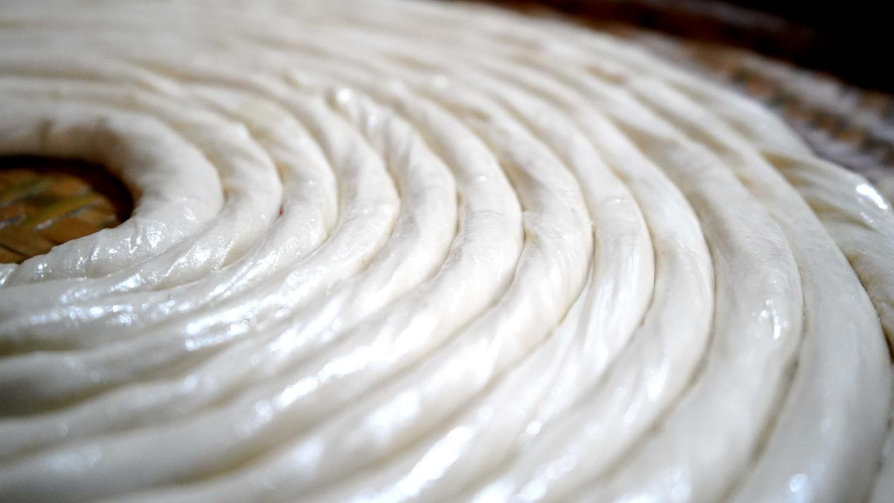 如今,臨近春節,現在的顧客訂單比較多。陳師傅說,以前每天制面才三十多公斤,一公斤面賣三四元,還不一定能賣完,現在每天做七八十公斤,每公斤十五六元,卻還供不應求。說話間,陳樣民和妻子還在重復著拉面的動作。絲絲線面飽含著永定客家人兒時的記憶,散發著別樣的古早味。