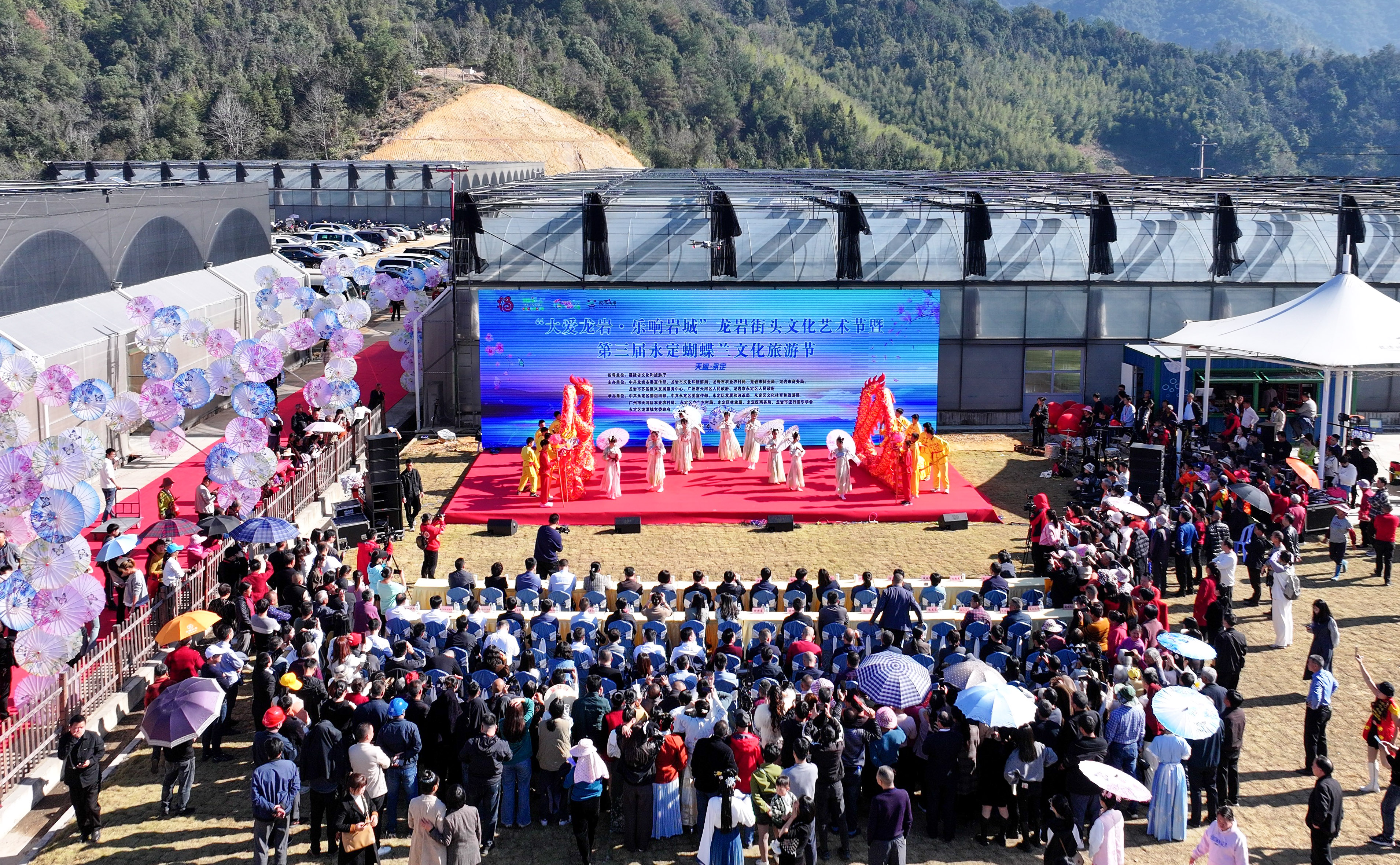 視頻加載中... 蝴蝶花開喜迎春 文旅融合啟新程 □ 賴招琴 1月22日,“大愛龍巖·樂響巖城”龍巖街頭文化藝術節暨第三屆永定蝴蝶蘭文化旅游節圓滿落幕。本屆蝴蝶蘭文化旅游節為期5天,是深入貫徹落實習近平生態文明思想和福建省委“深學爭優、敢為爭先、實干爭效”行動部署要求,以及文旅部對口支援和廣州-龍巖對口合作要求,進一步提升永定文旅經濟發展的一次盛會。在對口支援(合作)的鼎力加持下、在三大知名樂隊的傾情演繹下、在“蝶戀花”“桫欏谷”的浪漫邂逅下,全面展現清新優雅、蝴蝶翩躚的龍潭蝴蝶蘭文化旅游小鎮的新風貌,全力展示深入開展主題教育、對口支援(合作)、黨建引領鄉村振興等實踐成效,為廣大市民游客呈現了一場精彩難忘的農文旅融合的饕餮盛宴。 一、主題鮮明,對口支援合作成果落地見效 本次活動由福建省文化和旅游廳指導,中共龍巖市委宣傳部、龍巖市文化和旅游局等市直部門和廣州市天河區人民政府、龍巖市永定區人民政府聯合主辦,山海協作單位廈門市翔安區應邀出席,三方合力,規格和形式全面升級,實現“共辦、共建、共贏”目標。