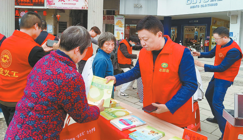 日前 ,永定區計生協會組織協會和社區志愿者在南門街商貿廣場開展“學雷鋒”志愿服務活動。圖為社區志愿者向周邊群眾免費發放《育兒寶典》《青春健康宣傳折頁》《公民健康素養66條》、垃圾分類倡議書等宣傳材料。 融媒體記者 傅利昌 通訊員 范龍茂 攝