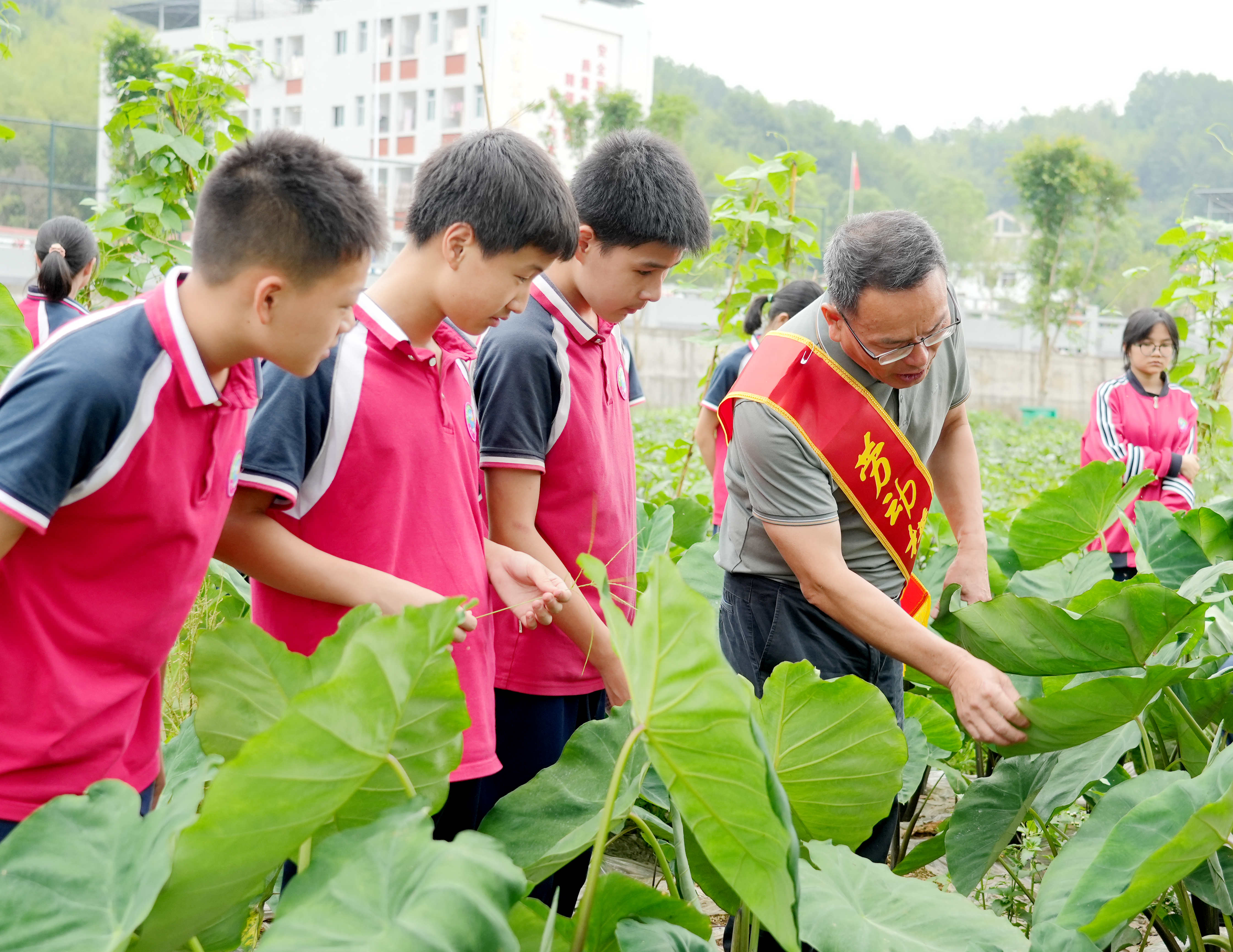 在學?!伴_心農(nóng)場”,勞動模范與同學們近距離接觸、體悟勞模精神,互動交流,學習勞動技能。永定區(qū)勞動模范、區(qū)農(nóng)業(yè)人才協(xié)會仙師分會會長、仙師鎮(zhèn)農(nóng)業(yè)站站長、高級農(nóng)藝師范良桂,向同學們現(xiàn)場講解蔬菜種植知識,指導同學們養(yǎng)成熱愛勞動的好習慣。