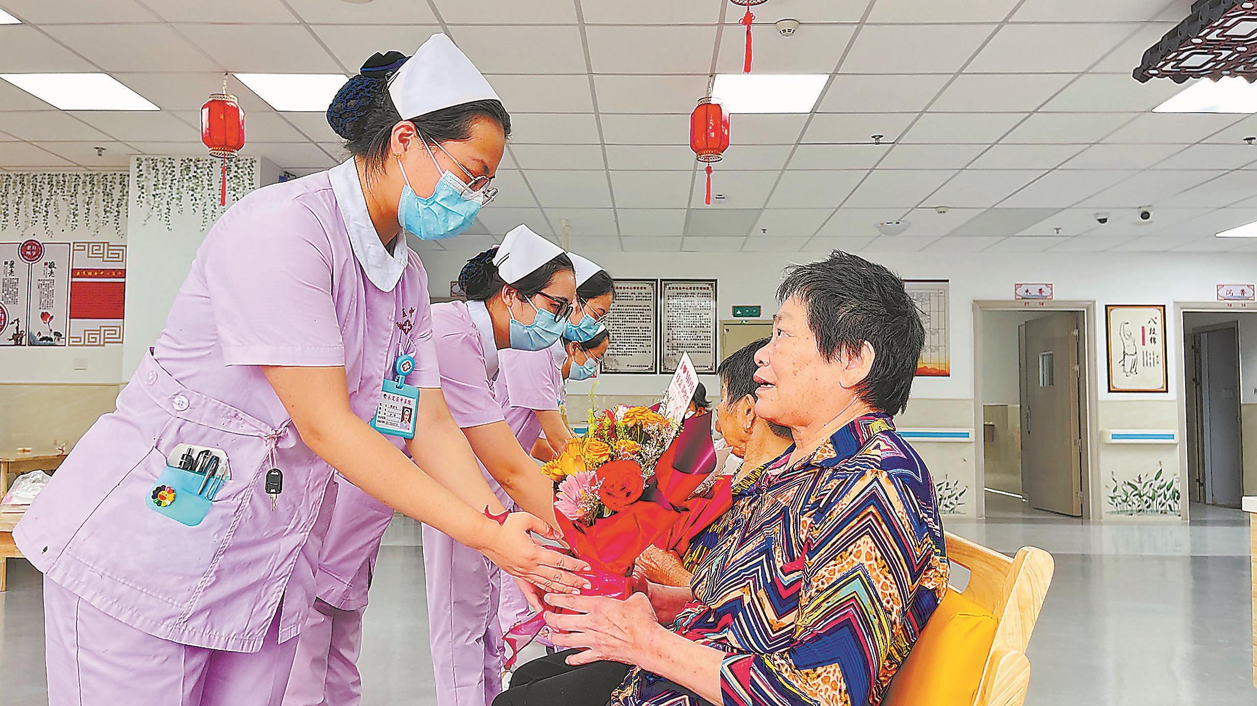 11日,龍巖市永定區(qū)中醫(yī)院醫(yī)養(yǎng)結(jié)合中心的護(hù)士們提前為在此護(hù)理的母親們過節(jié),送上鮮花和祝福。熊川 攝