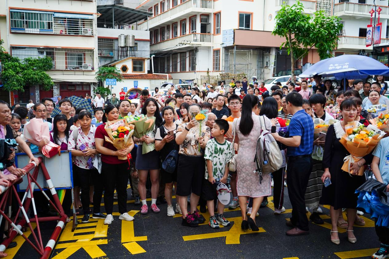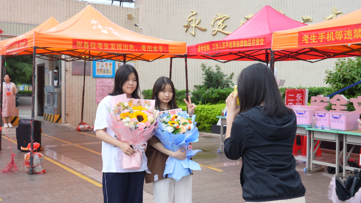 在永定一中考點門前,早早等候的家長們或手捧鮮花,或手舉手機、相機,隨時記錄下孩子們走出考場、合影留念的精彩瞬間。美麗的鮮花,熱烈的掌聲,真誠的祝福,暖心的擁抱……精彩難忘的瞬間令人感動淚目。