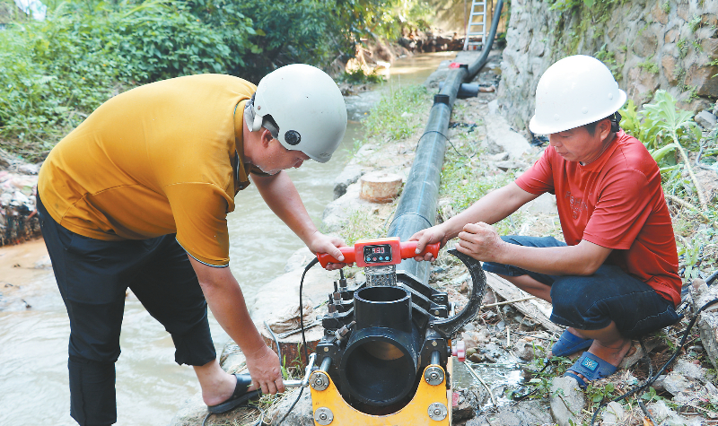 今年,永定區住建局結合老舊小區改造項目鋪設18公里污水管網。四年來,永定城區累計鋪設污水管網65公里,鄉鎮鋪設污水管網56公里,有效推動了汀江支流、永定河、金豐溪水質提升,達到3類水標準。圖為近日,永定城區臺邊小區幾名工人在河邊鋪設污水管。 通訊員 熊川 攝