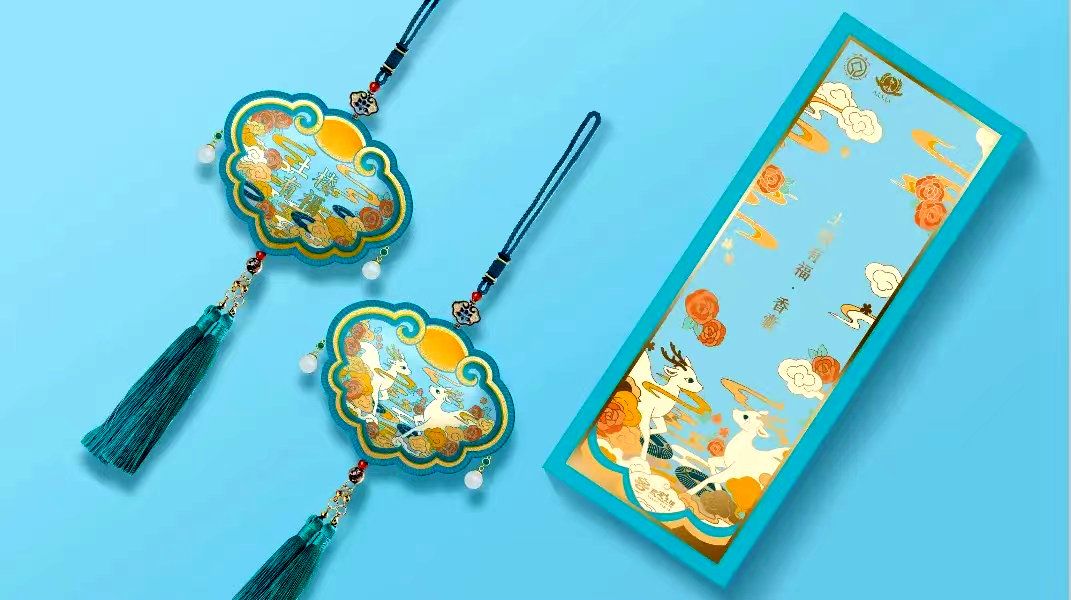 “福星高照—香囊”產品,以永定吉祥動物“?”為主體,搭配?樓建筑、如意、祥云等,寓意“福祿永定 萬福如意”。