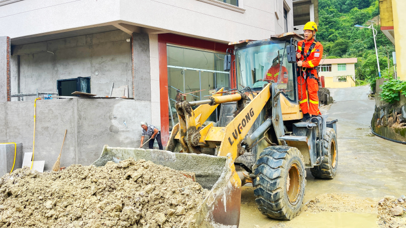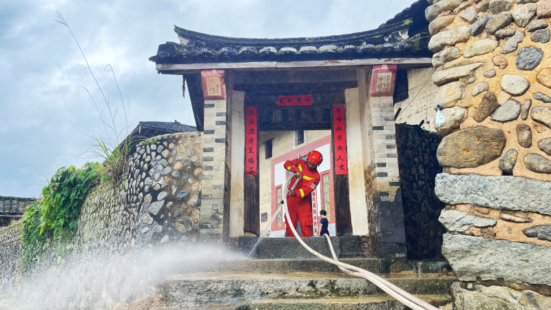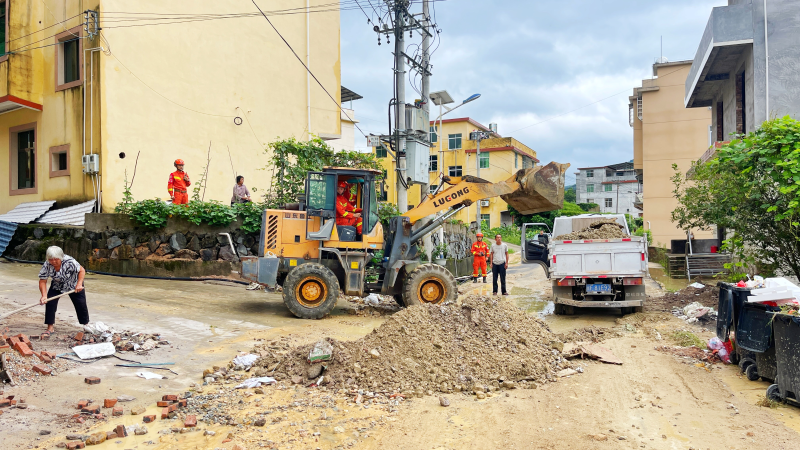8月21日,在永定區湖坑鎮南中村,受暴雨影響,不少民房進水,淤泥堆積嚴重,福建省森林消防總隊龍巖支隊的27名除險馳援隊伍利用水槍、鐵鏟等工具,對民房堆積的淤泥進行全面清理,同時利用鏟車對塌方、溜方的村主干道進行清障。