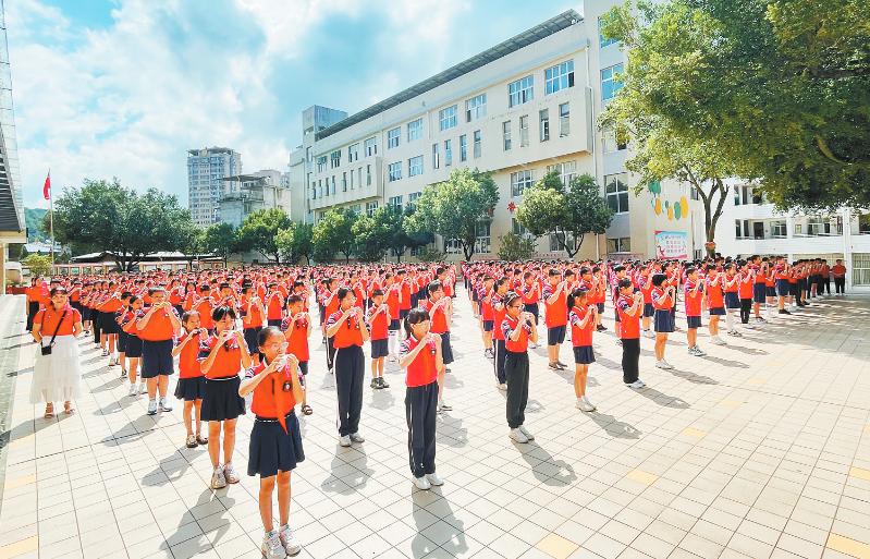 9月9日,在永定區實驗小學內,上千名學生齊聚操場,用吹奏陶笛的方式來為學校的老師獻禮。通訊員 熊川 攝