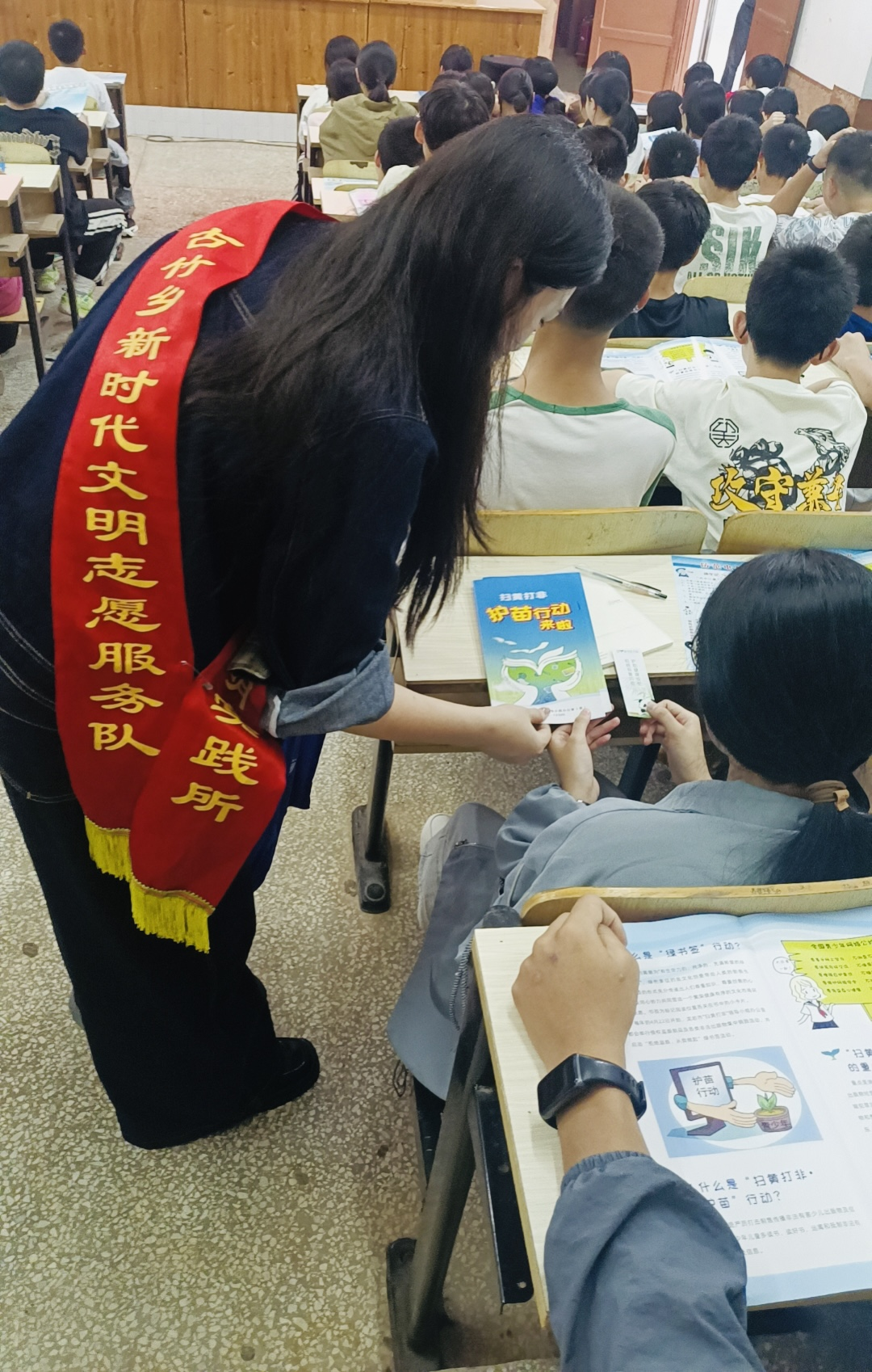 活動現場,志愿者通過發放宣傳折頁、綠書簽,互動問答等豐富形式向學生們科普了“掃黃打非·護苗”“綠書簽”行動,宣傳了網絡不良信息和非法、盜版讀物的危害,引導學生們增強自我保護意識和辨別能力,遠離不良信息,抵制有害出版物。