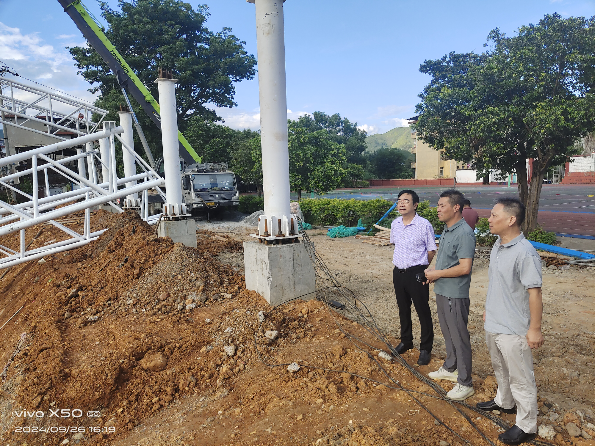▲ 9月26日,區(qū)財(cái)政局副局長廖培模帶隊(duì)到撫市鎮(zhèn)察看中央專項(xiàng)彩票公益金項(xiàng)目——撫市鎮(zhèn)體育公園(一期)推進(jìn)情況,并提出指導(dǎo)意見。
