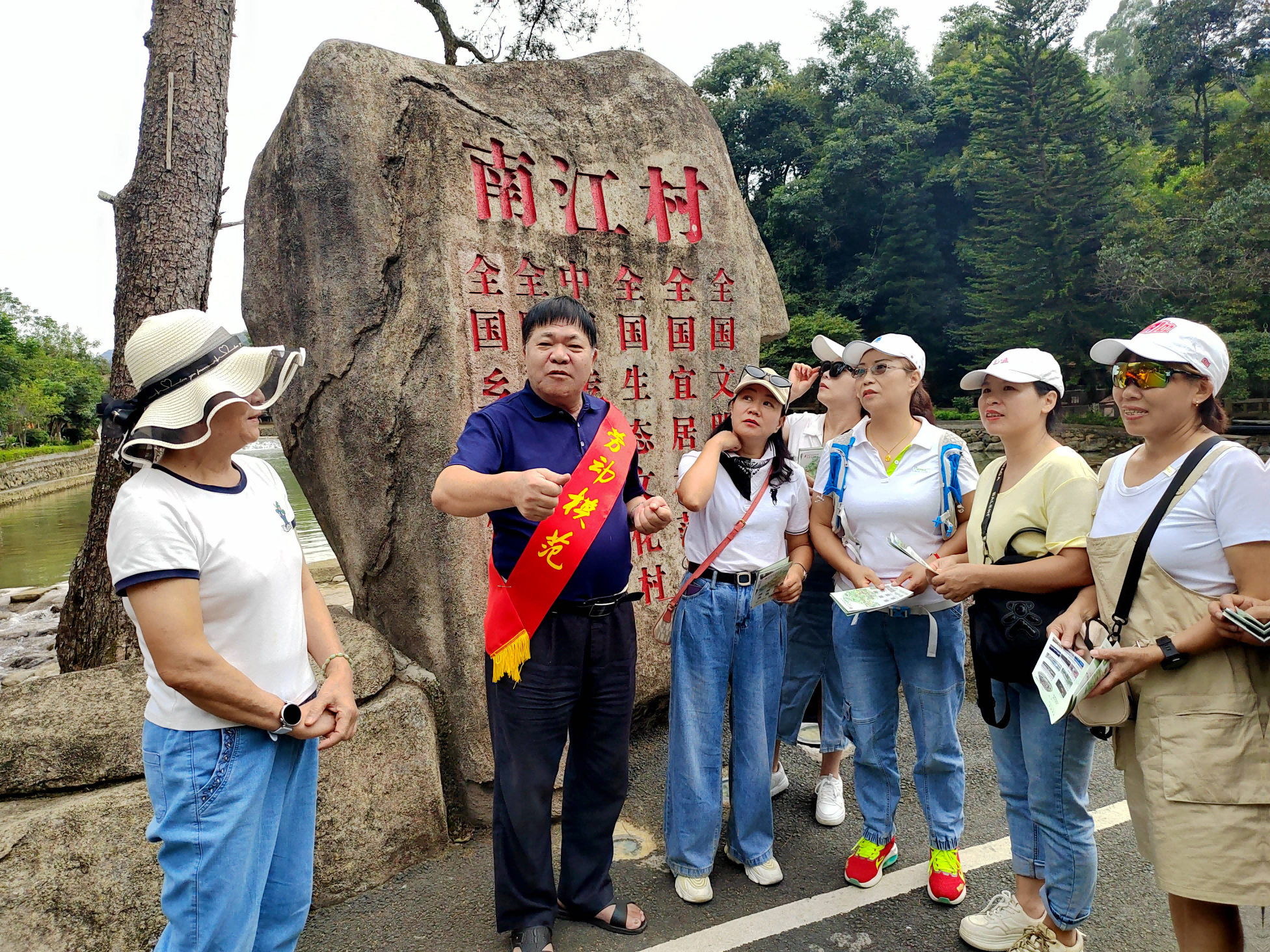 ▲ 福建省勞動模范江道明自豪地向游客推介自己美麗的家鄉——全國文明村、中國傳統村落湖坑鎮南江村。 河暢、水清、岸綠、景美,20多座客家土樓沿溪依山就勢而建,或方或圓,錯落有致……走進全國文明村、中國傳統村落湖坑鎮南江村,景色猶如一幅詩意田園畫卷,慕名而來的游客絡繹不絕?!摆s上國慶假期,村里比平常熱鬧多了?!备=ㄊ趧幽7?、南江村黨支部書記、村委會主任江道明放棄休息,在村里堅守在自己的崗位上,用心用情為游客服務,自豪地推介美麗鄉村建設取得的豐碩成果,在帶給游客舒心愉悅體驗的同時,也為當地文旅產業發展貢獻自己的一份力量。