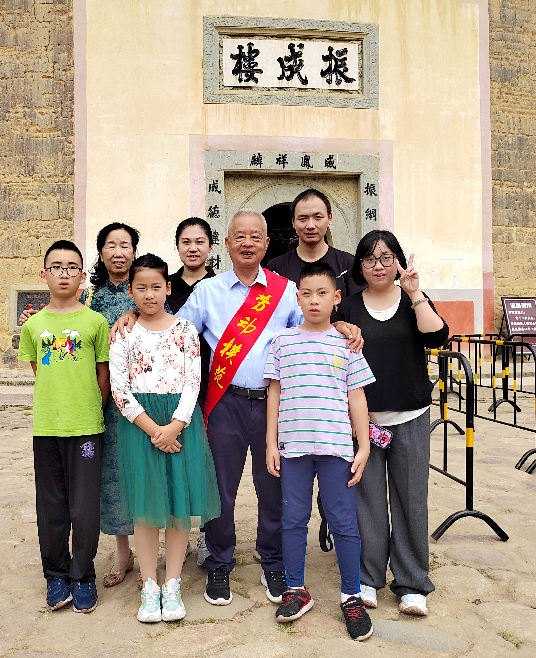 ▲ “福建省五一勞動獎章”獲得者林日耕的講解,讓游客游覽其中深有感觸,難以忘懷。 在景區,講解員們也十分忙碌。在世界文化遺產振成樓,“福建省五一勞動獎章”獲得者、金牌講解員林日耕10月5日一早就開始接待游客,10時30分,筆者見到他的時候,他已經接待過3批游客了?!翱图彝翗鞘侵腥A文化瑰寶,是大家庭、小社會和諧相處的典范。”在他的解說中,游客們不僅能領略土樓的建筑之美,更能感受到客家人的智慧和堅韌。一些游客見林日耕披著“勞動模范”的綬帶,便熱情地邀請他合影,感受幸福的“勞動美”。