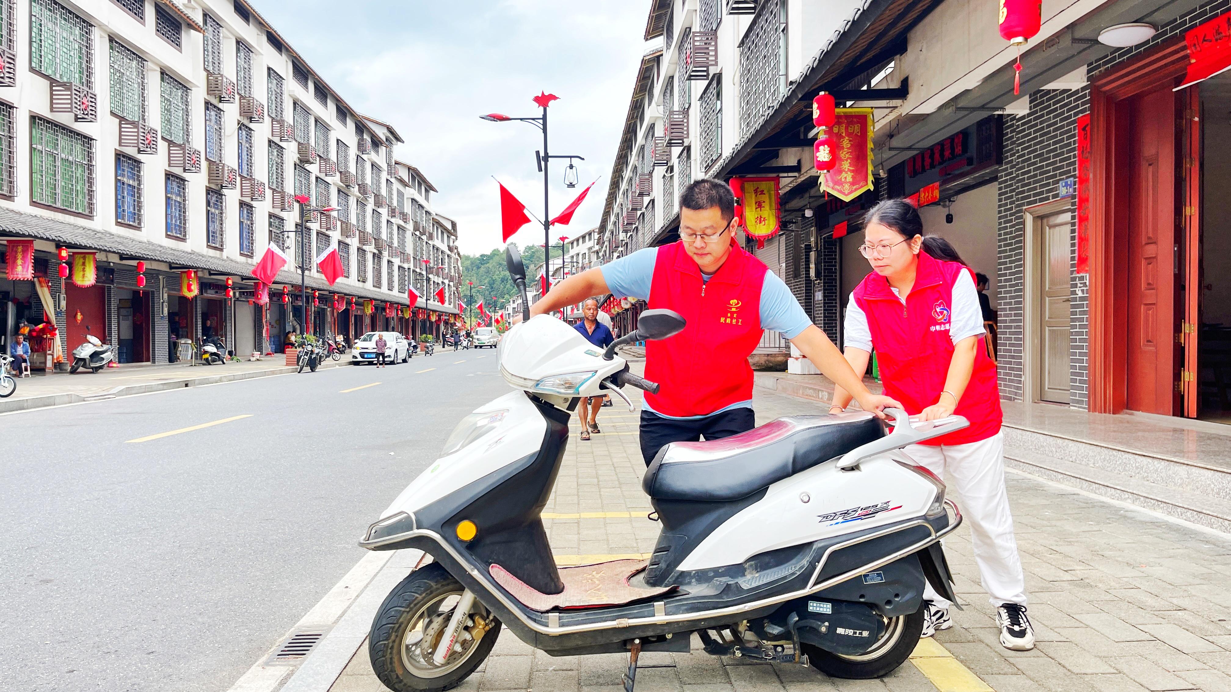 圖為紅色小鎮(zhèn)志愿者挪擺摩托車