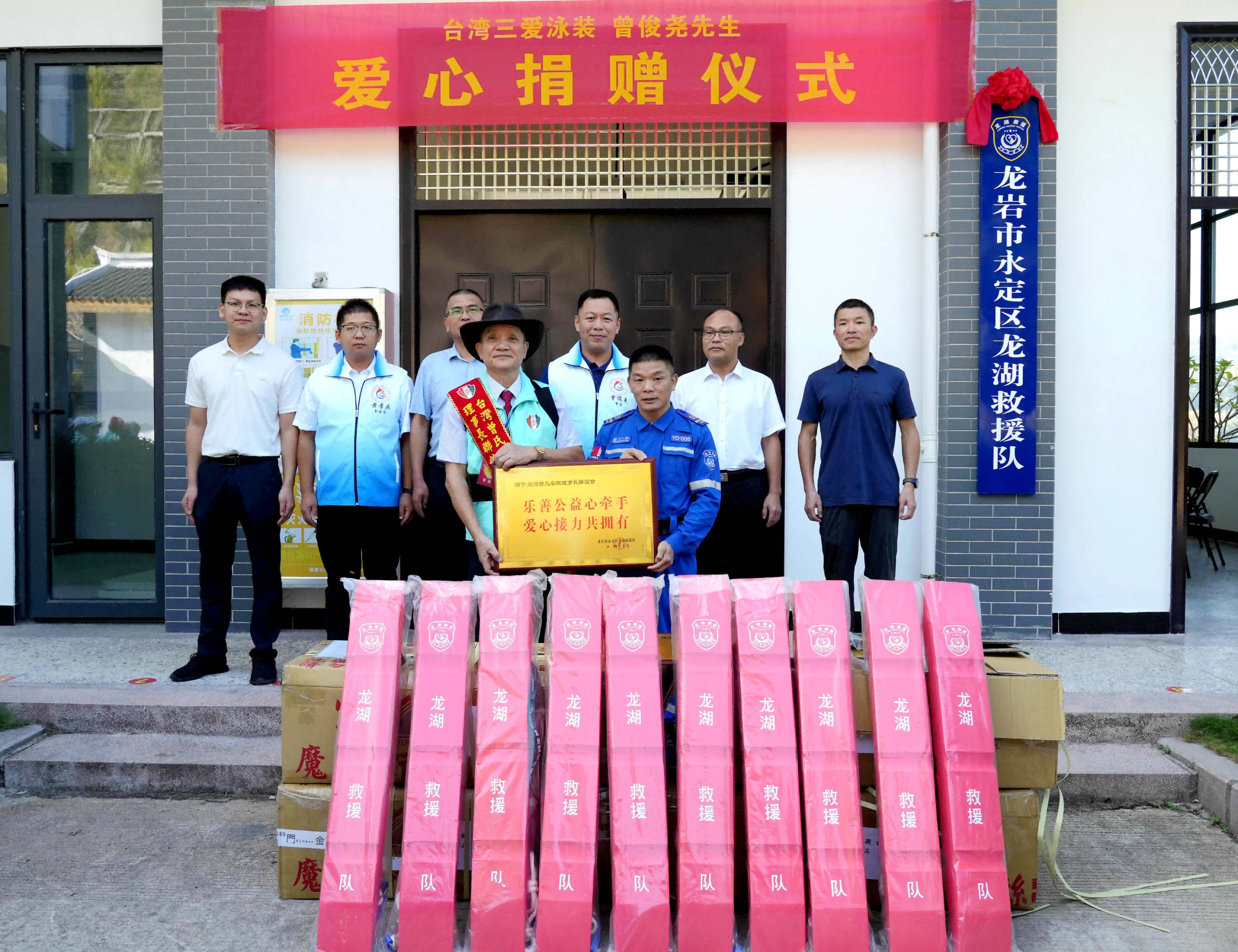 ▲ 10月13日,區(qū)委臺(tái)辦陪同臺(tái)灣曾氏宗親理事長(zhǎng)聯(lián)誼會(huì)的60多位臺(tái)胞到仙師鎮(zhèn)仙師村曾氏文化交流園、下洋鎮(zhèn)太平村曾氏宗祠等開展尋根謁祖交流活動(dòng),共敘兩岸深厚宗族情、濃濃血脈情。期間,臺(tái)灣曾氏宗親理事長(zhǎng)聯(lián)誼會(huì)向永定區(qū)龍湖救援隊(duì)贊助3000元人民幣,臺(tái)灣三愛泳裝董事長(zhǎng)曾俊堯?yàn)辇埡仍?duì)捐贈(zèng)價(jià)值20000元人民幣的40套水上應(yīng)急救生浮標(biāo)。龍湖救援隊(duì)向臺(tái)灣曾氏宗親理事長(zhǎng)聯(lián)誼會(huì)頒授了“樂善公益心牽手 愛心接力共擁有”牌匾,以表謝意。區(qū)應(yīng)急管理局、龍湖保護(hù)與發(fā)展中心、仙師鎮(zhèn)相關(guān)負(fù)責(zé)人參加捐贈(zèng)活動(dòng)。