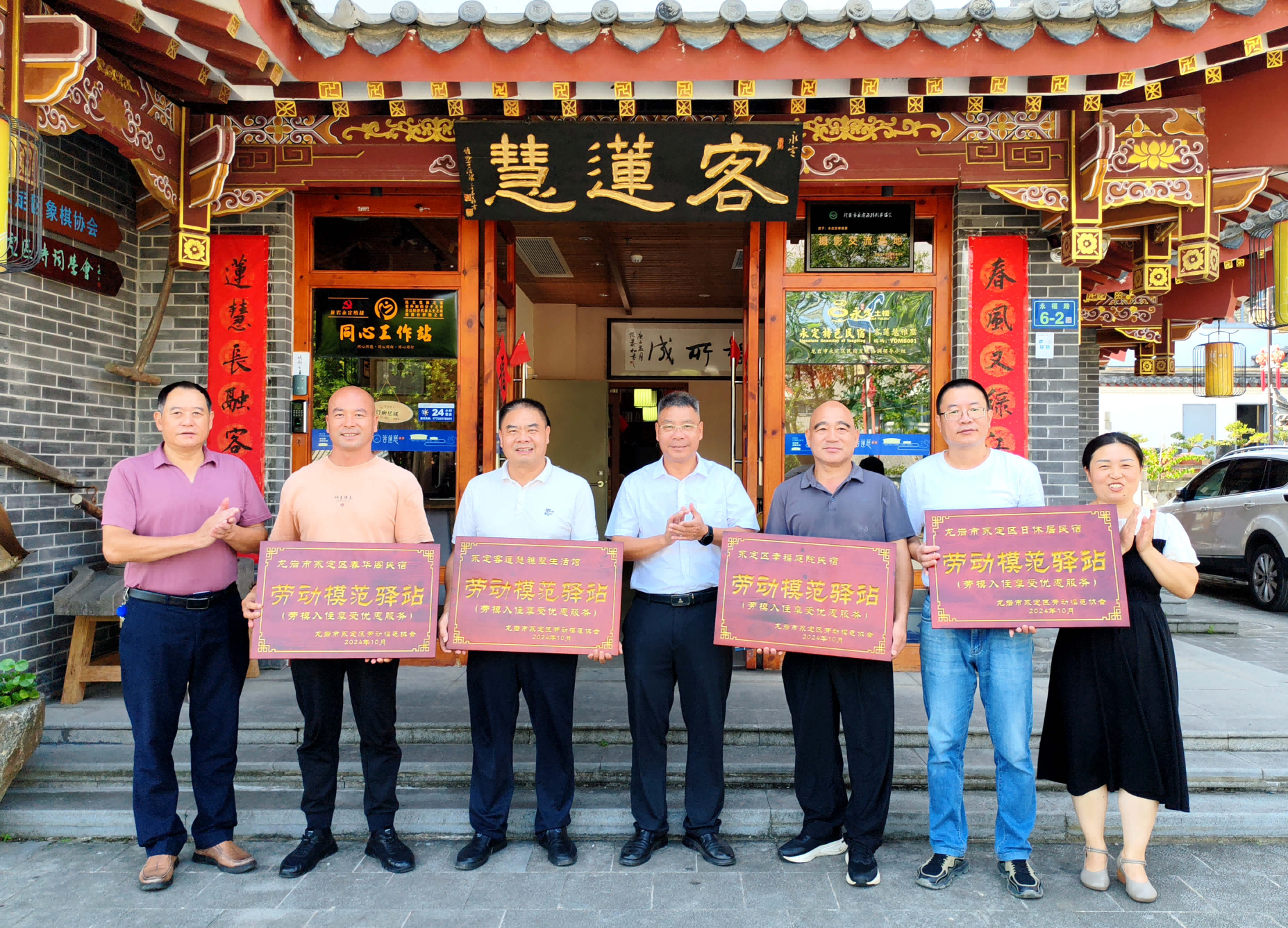 ▲ 10月15日,永定區(qū)勞動(dòng)模范協(xié)會(huì)在客家古鎮(zhèn)與永定客蓮慧雅墅生活館、永定區(qū)日休居民宿、永定區(qū)春華閣民宿、永定區(qū)幸福庭院民宿簽約,為這4家民宿企業(yè)頒授“勞動(dòng)模范驛站”牌匾,以進(jìn)一步優(yōu)化營(yíng)商環(huán)境,助力推動(dòng)民宿企業(yè)和民營(yíng)經(jīng)濟(jì)發(fā)展。今后,這4家民宿將為入住的全國(guó)各級(jí)勞動(dòng)模范(先進(jìn)工作者)提供優(yōu)待、優(yōu)惠、優(yōu)質(zhì)服務(wù)。