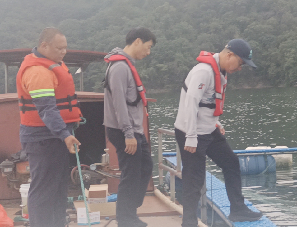 ▲ 11月5日,區龍湖保護與開發中心主任張偉才帶隊察看龍湖漁業公司苗種培育基地設施漁業項目實施情況。
