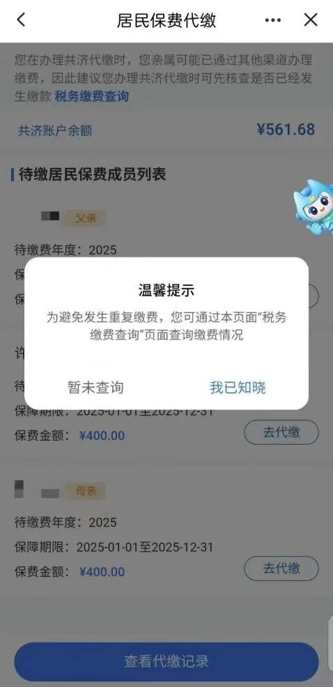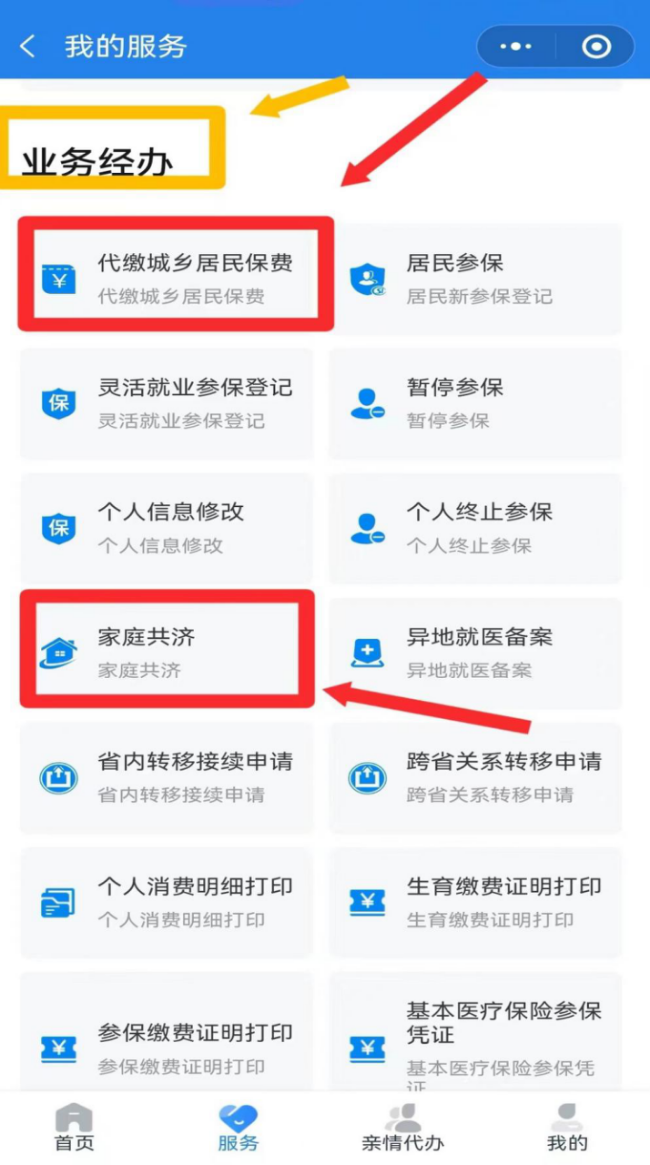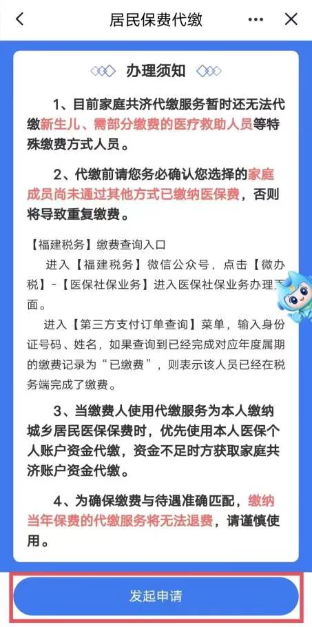 溫馨提示:如被邀請人暫時無法進行人臉認證,您也可以將其加為家庭共濟賬戶“臨時成員”,這樣您就可以為臨時成員代繳居民醫(yī)保費。但臨時成員無法享受家庭共濟賬戶里的其他服務。請盡快認證讓其升級為正式的“家庭成員” 第三步 代繳保費 家庭共濟賬戶創(chuàng)建、劃撥并邀請成員成功后,返回業(yè)務經(jīng)辦欄目,點擊【代繳城鄉(xiāng)居民保費】→仔細閱讀《辦理須知》后,點擊【發(fā)起申請】。選擇需代繳的家庭成員,點擊【去代繳】,按相關提示完成繳費操作。
