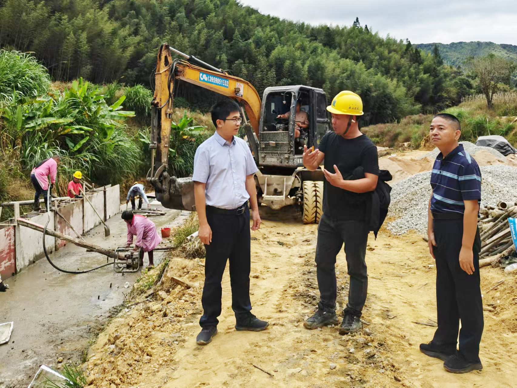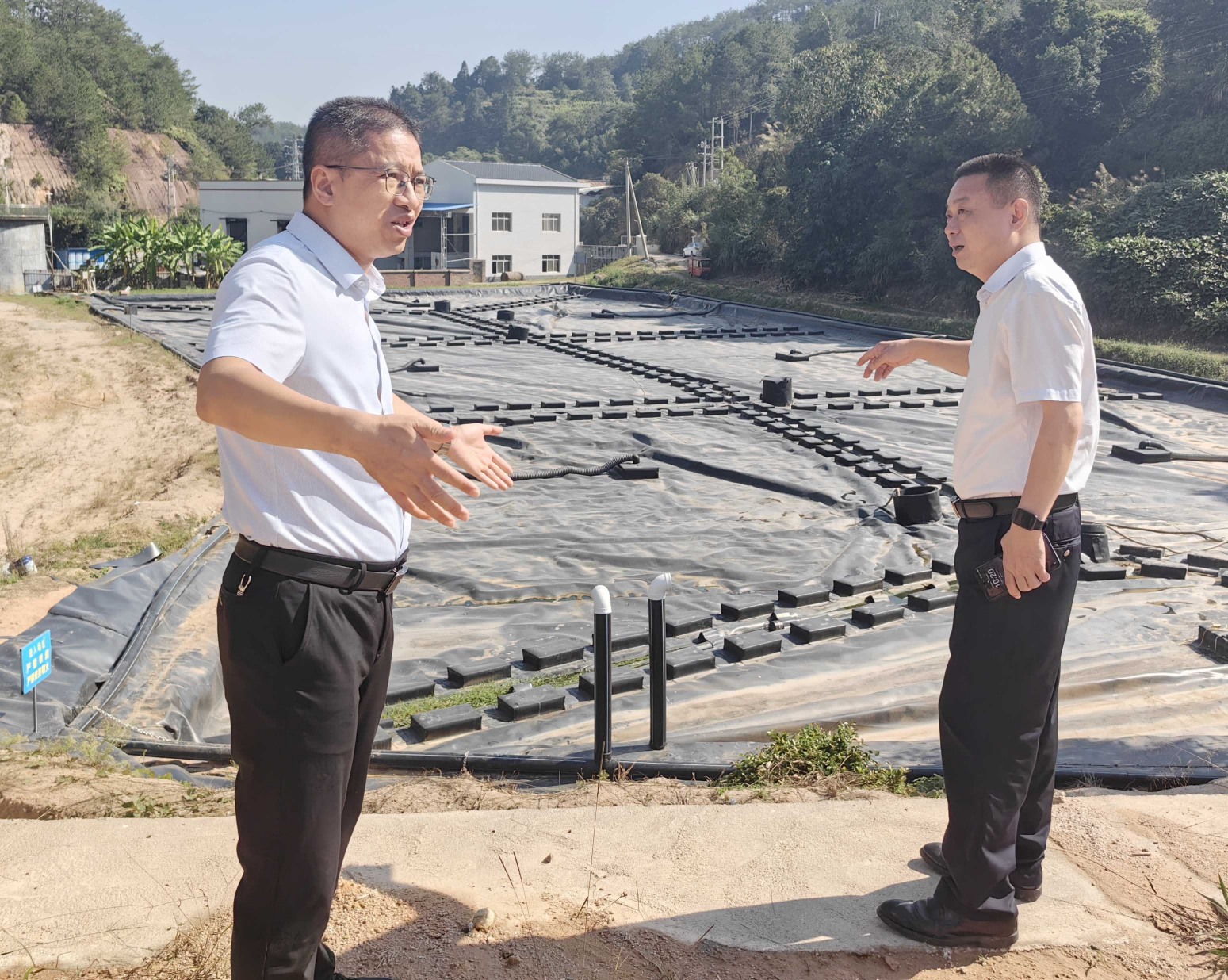 ▲ 11月11日,永定工業(yè)園區(qū)管委會主任李建熔、區(qū)城市管理和綜合執(zhí)法局局長張祖金現(xiàn)場討論廣藥王老吉(龍巖)產(chǎn)業(yè)園(永定)生產(chǎn)基地項目周邊地塊場地平整建設(shè)、永(定)梅(州)公路北側(cè)堰塞湖處置方案。