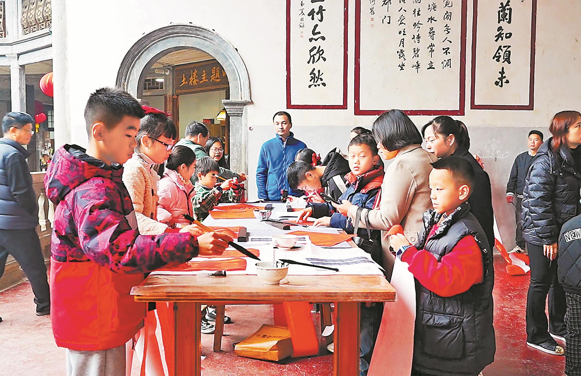 土樓人家春節期間組織孩子寫春聯和福字。 新春佳節,龍巖永定土樓“扮上”紅妝,一撥撥客家人齊聚土樓,大家話家常、互道喜,歡聲笑語此起彼伏,土樓內外充滿濃厚的年味。 湖坑鎮洪坑村振成樓顯得格外喜慶,紅燈籠高掛,春聯貼滿門楣。一群土樓娃齊聚振成樓內,身著傳統服飾,手執毛筆,揮毫潑墨,將對新年的美好祝愿化作一副副精美的春聯和一個個福字,透露出對土樓文化的熱愛。 “過年了,我們帶著娃娃來這里寫春聯,給孩子講解土樓楹聯的深刻內涵,讓孩子在新春佳節牢記愛國、愛家的傳統美德,將這份文化瑰寶傳承下去。”市民江夢說。 在位于永定高北土樓景區的僑福樓,居民為迎接春節早早地忙活了起來,貼春聯、掛燈籠、做美食、釀糯米酒……放在土樓門后、用紅布包裹的甘蔗,更是土樓人家春節特有的儀式感。 “這是老祖宗留下的傳統,我們要將這兩根甘蔗放在門后,一直放到正月十五。甘蔗象征著生活美滿幸福,寓意我們的日子節節高升。這是對新年的美好期許,也是對未來生活的無限向往。”土樓居民林永光說道。 一代代土樓人對傳統文化的堅守和傳承,讓新春佳節的溫馨喜慶氛圍在土樓里變得可感可知。年味不僅浸染著土樓居民,也吸引著八方來客。 今年春節期間,一系列既展現客家風情,又充滿新年氣息的民俗活動將在永定客家土樓熱鬧上演。 “春節長假,我們將推出吉祥彩鳳花車巡游、炫彩鳳凰飛行表演、舞龍舞獅、客家提線木偶、民間絕技、非遺歌舞劇等一系列活動,無論是想要感受傳統文化的魅力,還是沉浸式體驗夜游項目,永定土樓都能滿足游客的需求。”福建省客家土樓旅游發展有限公司市場營銷總監李長流表示,這是永定抓住春節旅游旺季,深入實施“文化進土樓”工程的行動之一。 近年來,永定區結合當地深厚的客家文化底蘊和濃郁的土樓民俗風情,實施“文化進土樓”工程和沉浸式夜游項目。“讓非遺與土樓深度融合,不僅豐富了景區的游覽內容,增強了互動性,還能夠讓傳統文化在傳承中得到創新。”李長流介紹說。 |