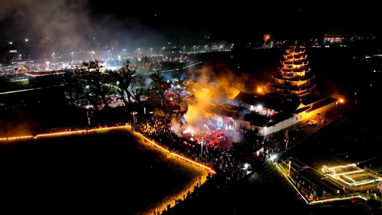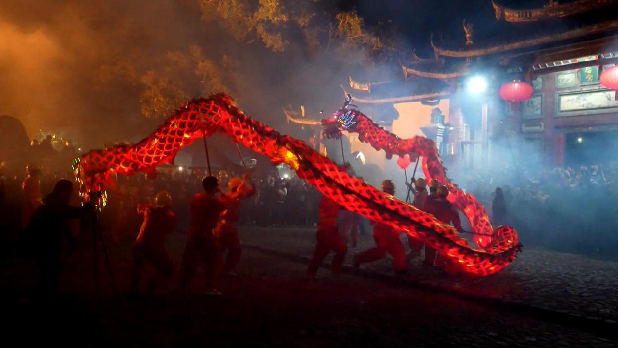 2月14日晚,農(nóng)歷正月十七,高陂鎮(zhèn)西陂村的天后宮前人頭攢動(dòng)、鑼鼓喧天,伴隨著喜慶歡快的鑼鼓聲,一條條彩龍上下翻騰跳躍,時(shí)而盤(pán)旋上升,時(shí)而俯沖而下,每一個(gè)動(dòng)作都剛勁有力,默契十足。舞龍師傅們憑借精湛的技藝,將龍的威嚴(yán)與靈動(dòng)展現(xiàn)得淋漓盡致。漫天的硝煙和焰火,讓來(lái)自各地的游客和村民歡呼雀躍,沉浸在客家傳統(tǒng)民俗文化之中。