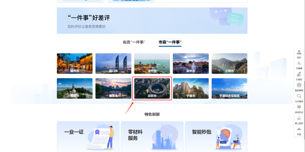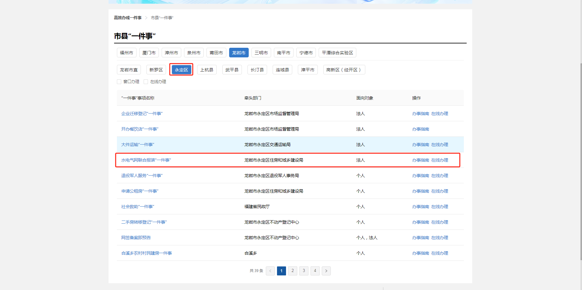 3.在“高效辦成一件事”重點事項服務專區頁面找到龍巖市選擇永定區的水電氣網聯合報裝“一件事”。