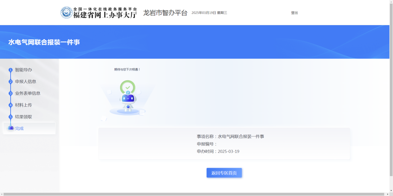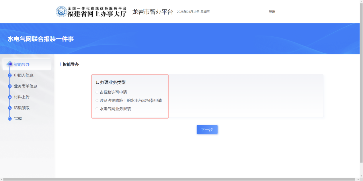 6.進入智能導辦頁面,申報水電氣網聯合報裝一件事,選擇需要辦理的業務類型。