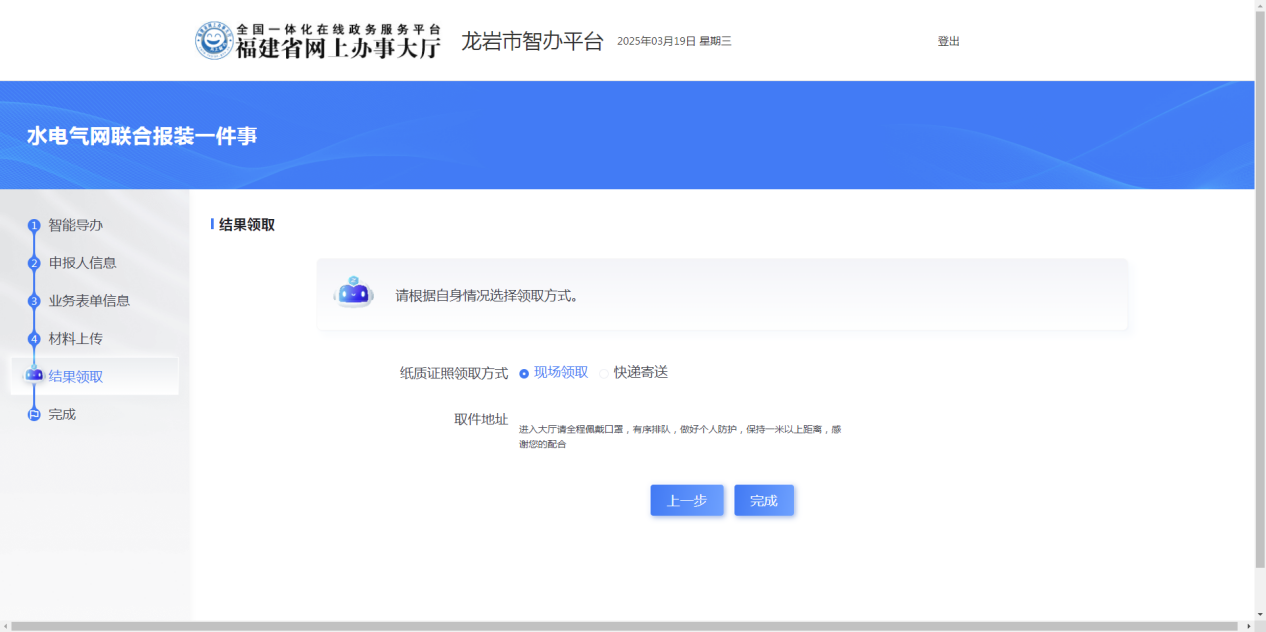 8.最后選擇您的領取方式就完成了對水電氣網聯合報裝一件事的申請。