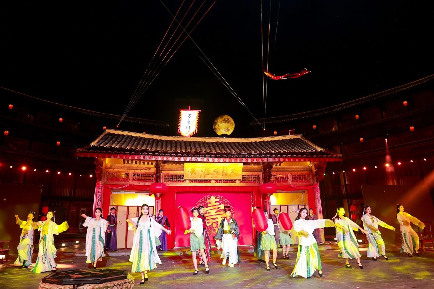▲永定振成樓微縮模型。 2024年4月,永定振成樓微縮模型成功入藏中國國家博物館,國家博物館表示,將把這件作品保護(hù)好、研究好、展示好。 《有土樓的地方就有家》宣傳片中,土樓人家“和平”“和睦”“和諧”“和美”的生活,將中國文化內(nèi)涵體現(xiàn)得淋漓盡致,給世界傳遞著最好的中國聲音,榮獲首屆“一縣一品”福建影像創(chuàng)意大賽金獎(jiǎng)。 央視頻在全球播出《建筑里的中華文脈》之土韻家園,宣傳介紹神奇的永定客家土樓營造技藝,產(chǎn)生廣泛的傳播效應(yīng)。 《福建如你》MV等20余部影視作品在土樓取景拍攝,進(jìn)一步提升了永定土樓的知名度、美譽(yù)度和影響力。 “東方甄選·福建行”活動(dòng)第一站走進(jìn)永定土樓,開播僅1小時(shí),在抖音成交額就突破了300萬元。 2025年3月底,福建土樓永定客家美食文化再登央視舞臺(tái)。在CCTV-2《中國美食大會(huì)》的聚光燈下,永定名廚李祥壽以一席“全福宴”驚艷全場(chǎng),搭配客家歌手曾嘉銘、張冬梅等4人演繹的宣傳歌曲《井》,將客家飲食文化與藝術(shù)魅力完美融合,讓永定土樓與客家文化再度“出圈”。 拓展旅游業(yè)態(tài) 讓文旅融合“出彩” 文化產(chǎn)業(yè)與旅游產(chǎn)業(yè)的融合發(fā)展,是實(shí)現(xiàn)文旅項(xiàng)目“1+1>2”增值效應(yīng)的重要途徑。永定區(qū)注重拓展旅游業(yè)態(tài),積極探索“演藝+旅游”“賽事+旅游”等,推動(dòng)文化旅游融合發(fā)展。