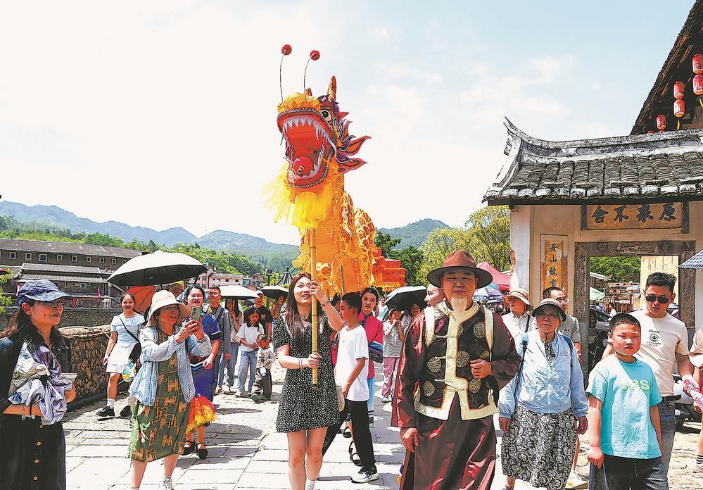 2日,福建土樓永定核心景區迎來客流高峰。大鼓涼傘、魁星點斗、走古事等民俗活動精彩紛呈,游客參與其中,感受客家文化魅力。
