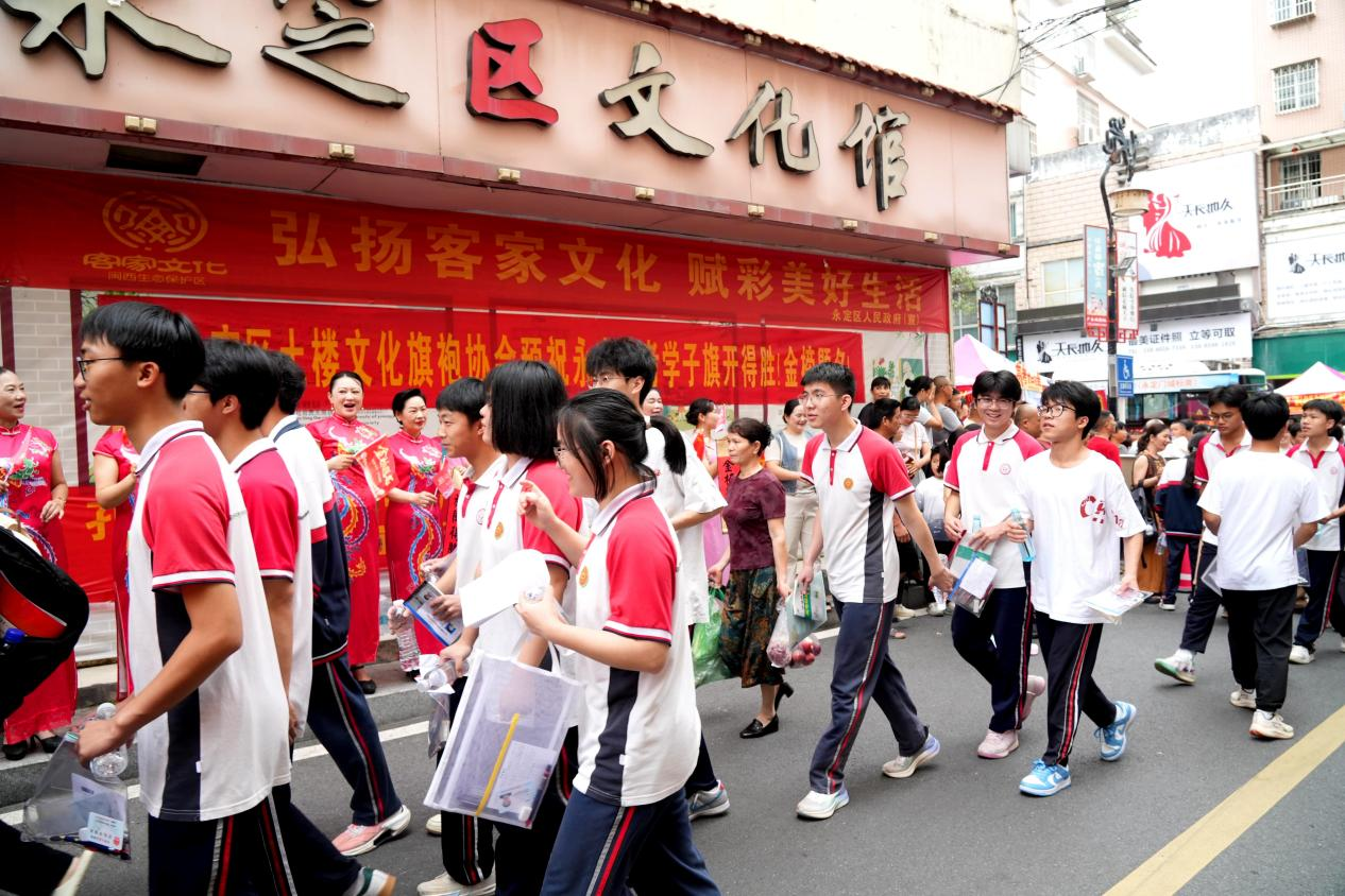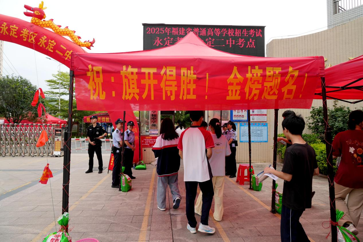 早上7時30分,永定一中、永定二中考點外已是人頭攢動,考生們步伐堅定,自信從容地走向?qū)儆谧约旱摹皯?zhàn)場”。人群中,身著旗袍、紅衣的家長和志愿者尤為引人注目,一聲聲“旗開得勝!金榜題名!”的祝福,表達(dá)著對考生美好期許。