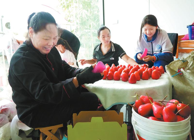 7月18日,筆者走進永定區(qū)峰市鎮(zhèn)河頭村百畝蓮霧基地,只見一顆顆色澤鮮紅、飽滿多汁的蓮霧掛滿枝頭,宛如紅寶石在陽光下熠熠生輝,格外誘人。果農(nóng)們穿梭于果林間,忙著采摘、分揀、打包,豐收的喜悅寫滿臉龐。 “我們這兒的氣候和土壤太適合蓮霧生長了!每棵樹分三批結(jié)果,每棵能產(chǎn)100斤左右。今年總產(chǎn)量預(yù)計15萬斤,線上線下同步開售,每斤能賣30元,訂單排得滿滿當(dāng)當(dāng),根本不愁銷路。”永定區(qū)峰市鎮(zhèn)河頭村黨支部書記、村委會主任溫建平說道。 蓮霧素有“嬌氣”之名,對氣候、土壤要求極高。而峰市鎮(zhèn)地處棉花灘庫區(qū),依托“龍湖”周邊獨特的小氣候,為蓮霧生長提供了天然沃土。為提質(zhì)增效,基地不斷升級種植技術(shù):搭建大棚精準(zhǔn)調(diào)控溫濕度,覆蓋黑網(wǎng)科學(xué)調(diào)節(jié)光照,通過緩季種植法實現(xiàn)冬至前持續(xù)采收。每到成熟季,基地里采摘游客絡(luò)繹不絕,訂單量也節(jié)節(jié)攀升。 “蓮霧不像芒果、荔枝那樣味道濃,這里的蓮霧咬一口汁水直冒,清甜又爽口,真的特別贊。我每年都來這兒采摘。”游客黃裔如高興地說道。 永定的自然環(huán)境與臺灣地區(qū)相近。近年來,峰市鎮(zhèn)依托龍湖氣候優(yōu)勢,以“黨建+產(chǎn)業(yè)”為引領(lǐng),由村黨支部領(lǐng)辦合作社主導(dǎo),規(guī)劃形成“一社二加三基地”的產(chǎn)業(yè)布局,大力培育種植、養(yǎng)殖專業(yè)合作社和家庭農(nóng)場,健全與農(nóng)戶的利益聯(lián)結(jié)機制,發(fā)展“1+X”休閑農(nóng)業(yè)。當(dāng)?shù)刂攸c引種臺灣特色水果,聘請臺灣農(nóng)技專家全程指導(dǎo)種植,助力漁民轉(zhuǎn)產(chǎn)增收。如今,龍湖沿岸已成功培育香水蓮霧、樹葡萄等20余個臺灣水果品種,種植面積超1000畝,為村民帶來了可觀收益,成為大家眼里的“致富果”。