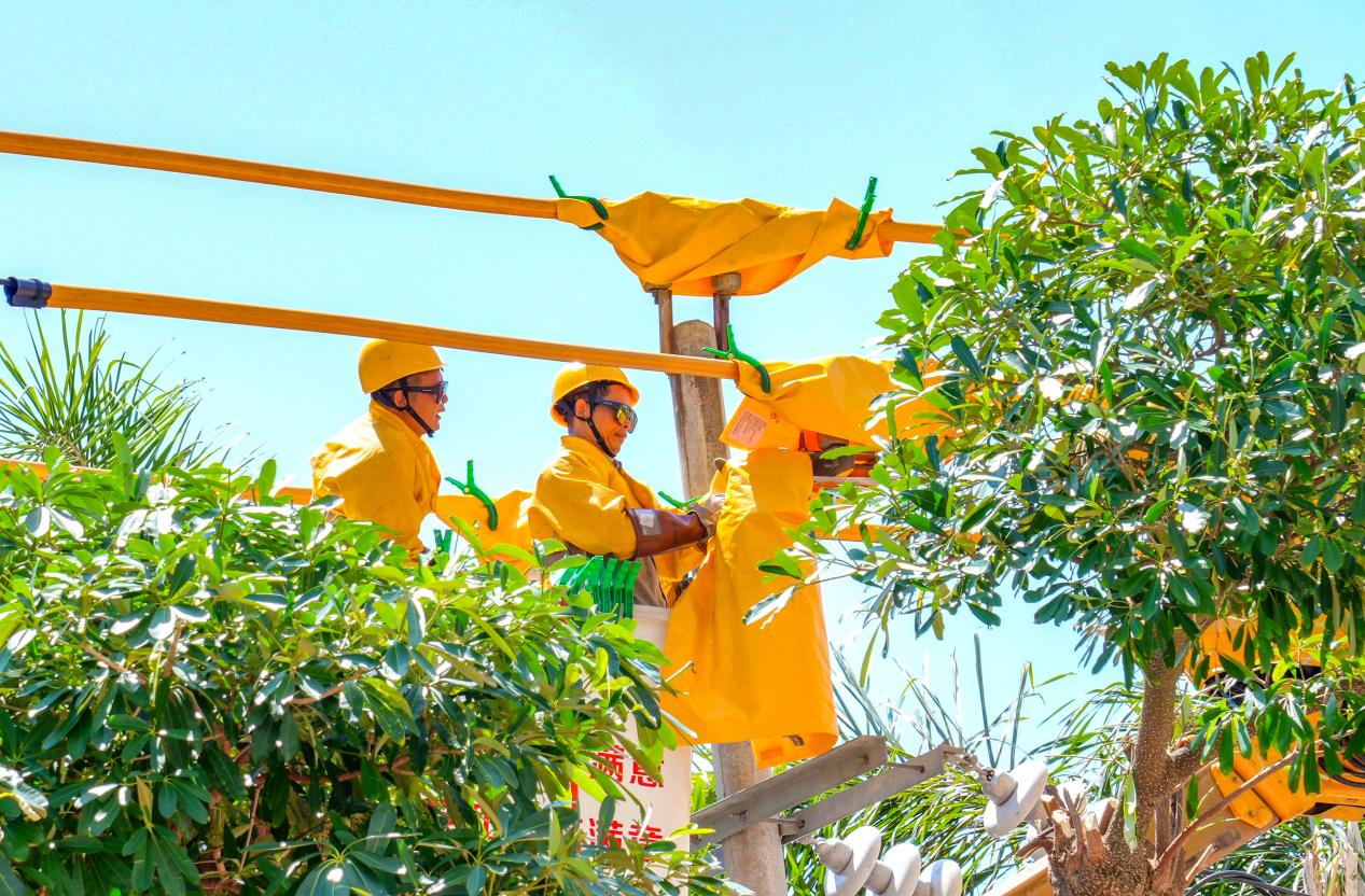 “別看絕緣服小小一件,罩在身上體感溫度要比外面高上許多?!辈煌k娮鳂I班班長闕興榕指著正在作業的斗臂車介紹。雖已過處暑,但正午的太陽依舊“火力全開”,作業人員的絕緣服密不透風,三層手套(內層棉紗、中層絕緣、外層羊皮)緊緊裹住手,嚴實的裝備讓他們如同“蒸桑拿”。