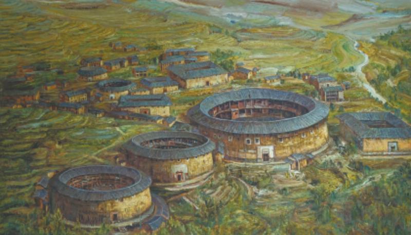 ■繪畫/黃水慶 配詩/董美英 每一縷炊煙 都是歸鄉的路 指向土樓的家園 每個秋天,我的心中 被金色的稻子填滿 豐收的謠曲傳來 在圓樓的瓦檐盤旋 稻子與土墻的光澤 無疑是客家人最愛的顏色 一個滋養生命 一個溫暖夢想 一代又一代,就這樣 在土樓與稻田的呵護中 沿著溪流潺潺的指向 走出大山,走向遠方