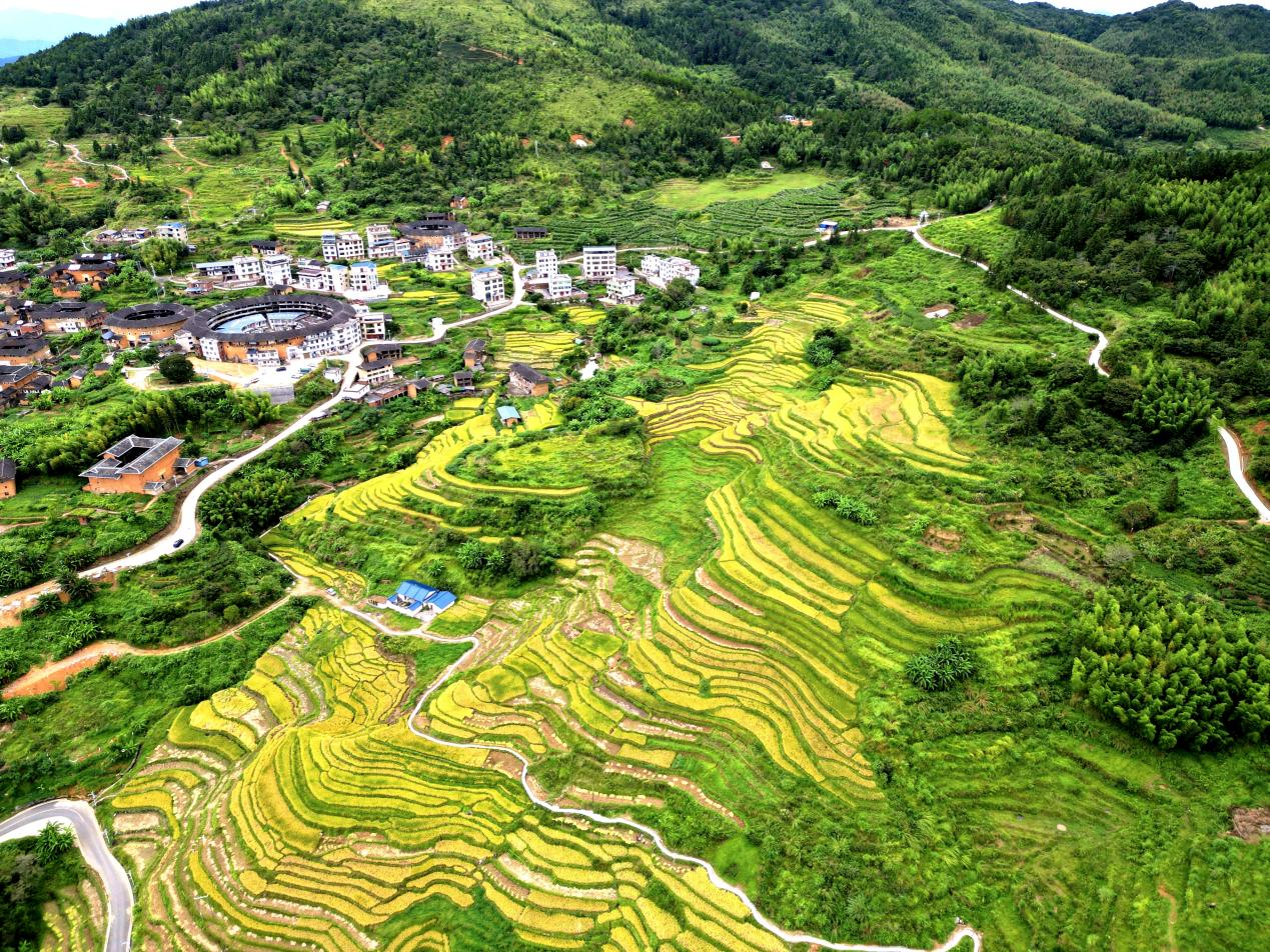 村民們正抓緊晴好天氣,忙著割稻、打谷、揚谷,田間地頭洋溢著豐收的喜悅。從空中俯瞰,已收割的田塊與尚未收割的金黃稻浪交錯分布,為土樓群增添了幾分秋日韻味,也讓游客近距離感受到農耕文化的魅力。