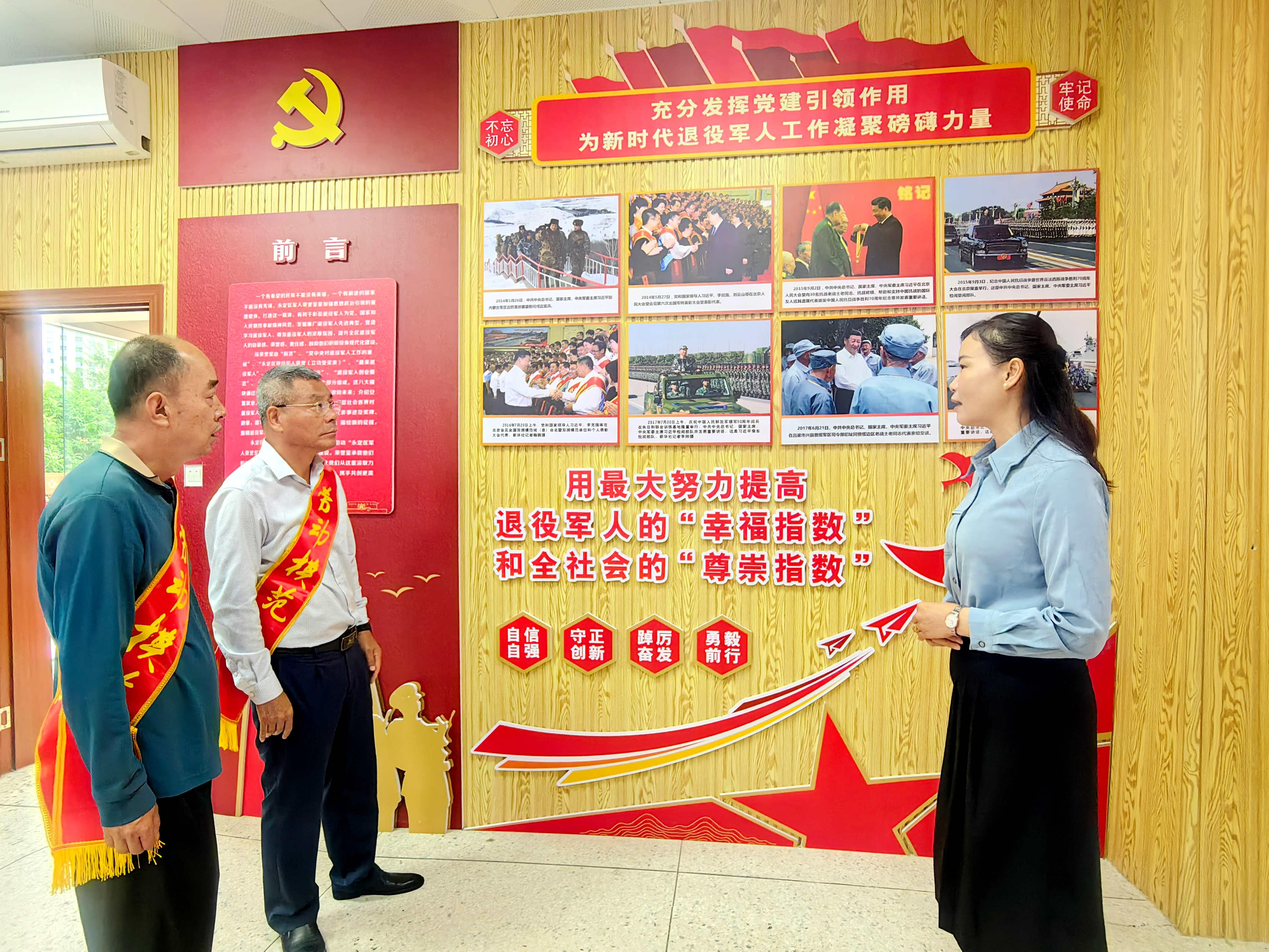 慰問活動后,區勞模協會會長劉永良、市勞模盧貴鋒還走進永定區軍人榮譽室參觀學習,直觀感受軍史文化和英雄精神,接受生動的國防教育,強化責任意識與家國情懷,表示要把軍人精神和勞模精神結合起來,以軍人為榜樣,進一步用勞模精神、勞動精神和工匠精神鞭策自己,不辱使命、不負榮譽。