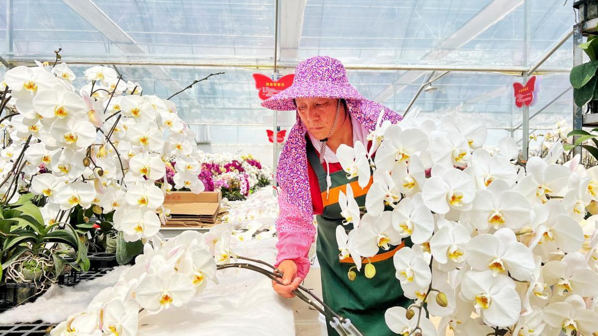 初冬時(shí)節(jié),永定區(qū)龍?zhí)舵?zhèn)楓林村蝴蝶蘭大棚內(nèi),一株株白色蝴蝶蘭如蝶翼般舒展,花瓣瑩白透亮,似要乘風(fēng)飛去。工人們手指翻飛,熟練地將開(kāi)得正盛的鮮花剪下,理齊花莖、套上保鮮膜,再小心翼翼裝車發(fā)往全國(guó)各地。 “這批花要發(fā)往北京、上海,昨天剛接了個(gè)廣州的加急單,蝴蝶蘭品相好,市場(chǎng)搶著要。”永定蝶戀花產(chǎn)業(yè)園總經(jīng)理謝凡生指導(dǎo)工人小心翼翼將鮮切花搬上貨車,車斗里堆滿的鮮花映著他眼角的笑意——這份“美麗事業(yè)”,正成為當(dāng)?shù)卮迕竦摹爸赂灰妗薄?/span>